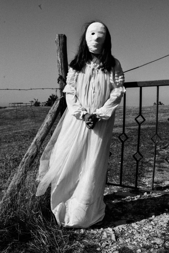 L’intera mostra è un dialogo del fantasma con il corpo a cui appartiene. L’autoritratto di schiena, la corda avvolta al collo, davanti a una finestra dal paesaggio celato; le bambine vestite di bianco, le maschere sui volti, colte davanti a un reticolato o a una staccionata di legno; la veste chiara e vuota a contrasto con il ramo secco o l’oscuro manicomio; l’uomo travestito da clown; il tendone maculato di un circo; tutte figure chimeriche, smarrite in una malinconia senza nome, che sembrano aspirare a una dimora perduta. E ancora, apice forse della mostra, l’autoritratto in cui l’autrice è chiusa in un velo bianco, simile a una tenda, mentre con il braccio e la mano destra si tocca la testa e sembra emergere dal suo involucro amniotico