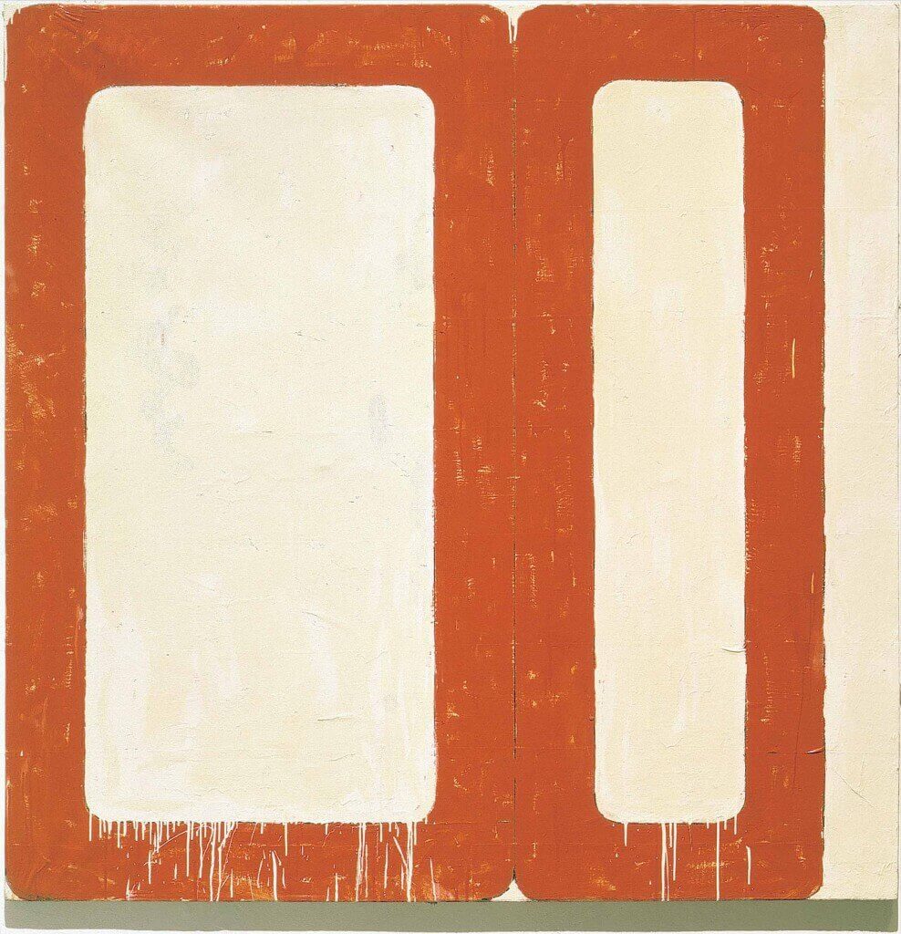 Un’opera di Mario Schifano – Tempo moderno, realizzata nel 1962 e presente nella collezione di Ileana Sonnabend esposta temporaneamente alla galleria Guggenheim – mostra, su una superficie quadrata, delle strisce di colore rosso arancione che tracciano due forme rettangolari, una più grande e l’altra più piccola. Quasi come fossero due cornici, dipinte e collocate all’interno della tela. Lo spazio dentro i due rettangoli si presenta monocromatico, di un colore bianco lattiginoso. Uno spazio delimitato e al contempo indefinito. Nel complesso si tratta di una composizione semplice, dalla struttura che potremmo definire geometrica. Ma il pittore ha lasciato che lo smalto biancastro colasse sul rosso della base dei due rettangoli, lo rigasse, introducendo così un elemento dinamico, una vibrazione, una traccia che segue e insieme segnala la dimensione del tempo.