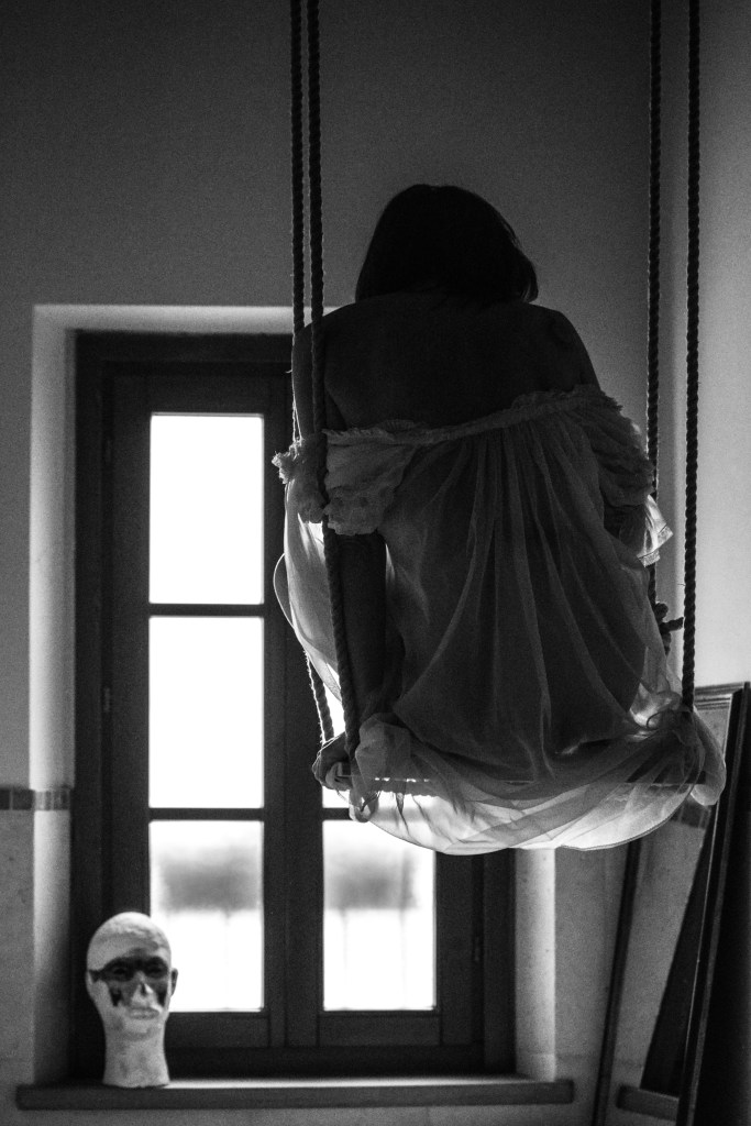 E in questo percettibile movimento di fuga Chiara Romanini si ritrova. Mentre fugge, trova la via del ritorno a casa. Fratturata in specchi e riflessi, dove il suo interminabile autoritratto si nasconde e si svela, ricompone se stessa come ninfa sempre nascente, nell’anima e nel corpo. Questa ri-creazione di sé è l’oggetto prediletto della sua indagine fra il nero e la luce. «Ecco perché, nonostante il nero sia il colore delle tenebre, esistono neri “luminosi”, ovvero neri che brillano prima di oscurare, neri che sono brillanti prima di essere neri” (Michel Pastoureau). Fotografa-regista delle proprie immagini, Chiara Romanini rifiuta il fluire del mondo come universo di immagini e ferma le sue visioni in “sculture” fotografiche, che hanno la felice sensualità del corpo e la malinconica magia del fantasma.