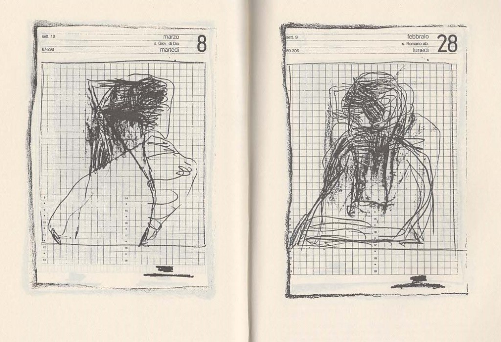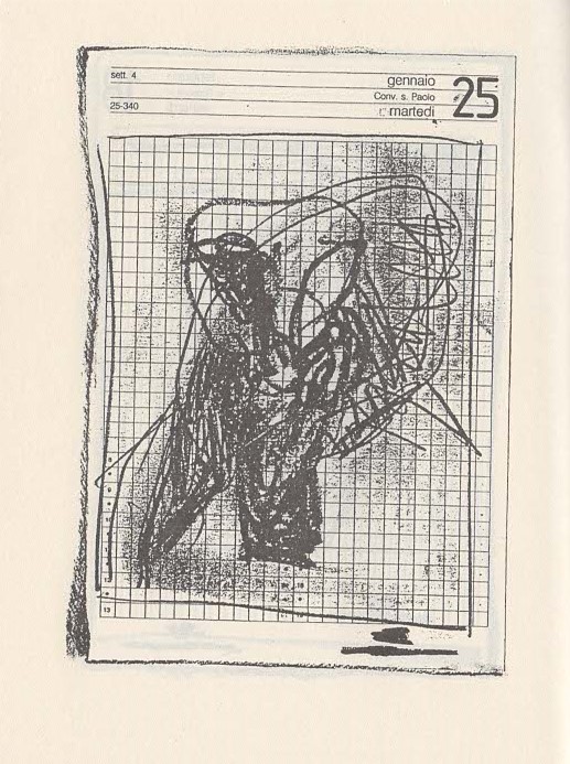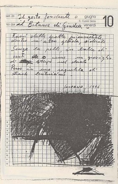 Scrive Giovanni del suo intervento: «Pagine strappate a più di un diario intimo di schizzi graffiati nell’attimo di un gesto: il gesto fondante. Altri fogli più aggrovigliati, anneriti: il bitume di Giudea, volontà che fugge nella tenebra per trovare dell’altro, per azzerare e sorprendersi. Reperti minimi, piccole pulsioni, frammenti fermati al volo – tempo che fugge».