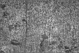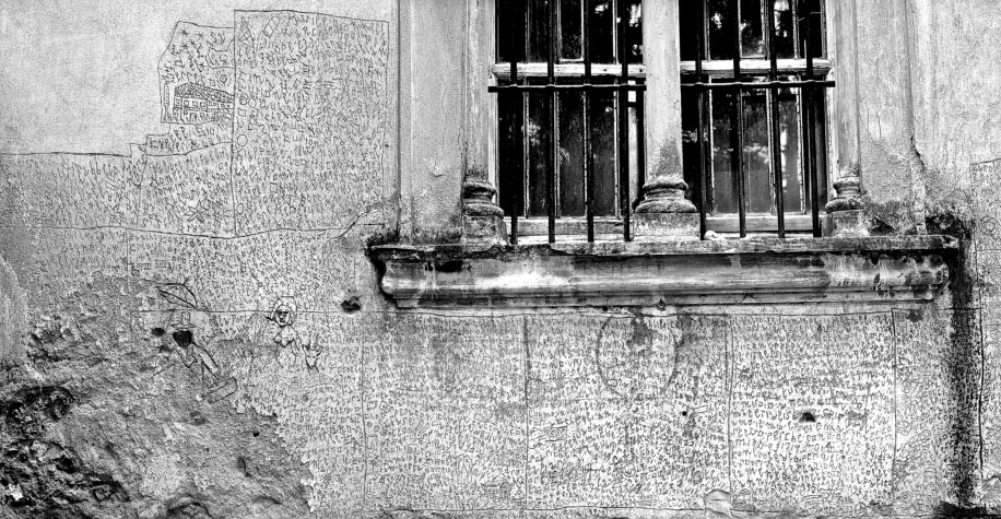 È stato detto e fatto molto per Nannetti, ma poco è stato possibile fare per salvare il suo capolavoro. Missione impossibile fin dall’inizio ma soprattutto ora che l’edificio è così degradato e il tempo sbriciola e lascia cadere in rena salnitra i suoi muri. E a terra, fra vetri e erbe e tegoli e altro, ecco brandelli di parole, disegni e numeri ncisi dal navigatore astrale: il poco intero se avvistato e raccolto si sfa fra le dita ome il sogno di una notte. È polvere che si sfarina all’aria il suo enorme graffito o al minimo tocco. Notiamo dei ritagli, porzioni rubate dai soliti ignoti e come abbian fatto non si sa, ci s’immagina, certo. Tutto è alla mano di tutti, vero, ma non capiamo se non come miserabile grettezza feticista tale appropriazione: essere lì è come esser davanti a un corpo in naturale decomposizione, vi si respira un’aria pesante come rattrappita, intessuta dai tanti dolori e tormenti di una massa d’uomini e donne che sembrano ansimare ancora fra mura e erbe come presenza obliqua. Impossibile pensare ad una mutilazione se non per offesa sacrilega.