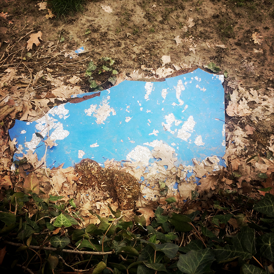 Nella fotografia del 24 marzo 2018 c’è, in mezzo all’erba secca, uno specchio rotto – è troppo pensare che rifletta il cielo, con quel celeste di primavera, sua ultima funzione patetica?
