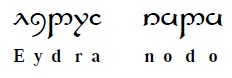 Vediamo ora una iscrizione in tengwar, nel modo detto “del Beleriand” sulle Porte di Durin; in questa iscrizione, oltre alla frase di benvenuto nel Regno di Durin (incisa sull’arco) sono presenti in particolare tre simboli, dislocati separatamente dalle altre tengwar, in posizioni isolate; sono riportati di seguito:
