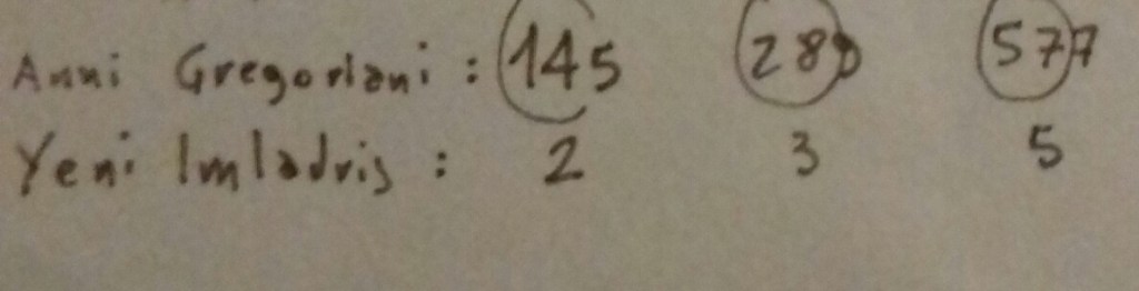 L’operazione successiva è stata quella di dividere 137 per il numero delle rune (sempre come sulla tomba di Balin…) ed il risultato è: 137/7 = 19,5714285714. Un numero che non significava niente… oppure era una specie di data? Pensando proprio alle date ho provato ad indagare sull’argomento della comparazione fra il nostro Calendario Gregoriano e quello elfico di Imladris (i calendari sono anch’essi disponibili nell’Appendice B de Il Signore degli Anelli).