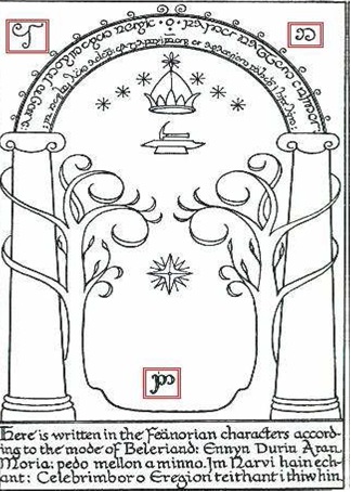 Ricordiamo anche quanto dice Gandalf a proposito delle lettere che compongono l’iscrizione: <<Sono intarsi d’ithildin, che riflette solo i raggi di luna e delle stelle, e dorme sin quando non sente il tocco di chi pronunzia parole ormai da tempo obliate nella Terra di Mezzo.>>