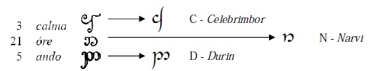 Il primo ghirigoro è palesemente posto sopra la prima tengwa dell’iscrizione: la e di Ennyn. Altrettanto possiamo affermare del secondo ghirigoro, ottenendo la y di Ennyn. Il terzo ghirigoro è posto sul gambo della d di Durin; una posizione abbastanza evidente da poter assumere che la d è la nostra terza lettera. Il quarto ghirigoro separa la tengwa úre, ossia u, da r in Durin; se consideriamo la lettera successiva alla nostra linea immaginaria, otteniamo la r di Durin. Il quinto ghirigoro è posizionato in maniera inequivocabile sulla a di Aran.