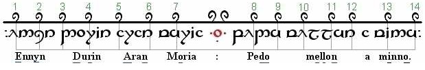 Le Porte di Durin, tuttavia, non ci consegnano di nuovo tutti i loro misteri: se si conta il numero di lettere sulla prima linea di scrittura sull’arco, con l’eccezione di quelle che non hanno valore numerico (in questo caso si servirono dell’arco nel Modo del Beleriand per rappresentare la a e di un portatore con un tehtar per la i), si può notare che le lettere sono esattamente 13 per ogni lato (considerando come “centro” la tengwa úre sulla sommità dell’arco).