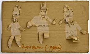 cartone, hanno un tratto infantile che evoca i disegni dei bambini ma raffigurano scene che sicuramente non appartengono al loro mondo. Le sculture, realizzate recuperando pezzi di legno, radici, rami e poi assemblate con il fil di ferro, sembrano indietreggiare impaurite in precario equilibrio e sul punto di cadere. Le scene e le figure dei bassorilievi, intagliati su tavolette di legno, nascono da un segno, un colpo, un’incisione, un nodo già presente, e si sviluppano intorno ad esso, indicando una grande fantasia e un occhio attento a come trasformare in arte qualunque oggetto. Altre opere sono ricavate lacerando e strappando la superficie del cartone. Benché fosse capace di riflessioni anche folgoranti, Raggio sa essere creativo manipolando materiali elementari: il legno, le foglie, l’argilla, il fil di ferro, che aveva conosciuto nella sua infanzia contadina in una famiglia di mezzadri. Lo conobbe e lo apprezzò in modo speciale il pittore Claudio Costa, che all’Ospedale Psichiatrico di Genova-Quarto aveva inventato il suo atelier di arte-terapia, da cui sarebbe nato il Museo ora dedicato alla sua memoria.