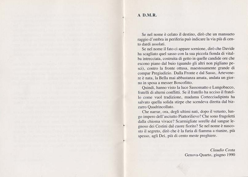 in periferia può indicare la via più di cento dardi assolati. Se nel nome il fato ci appare sornione, dirò che Davide ha scagliato quel sasso, con la sua piccola fionda di vitalba intrecciata, costruita di getto in quelle candide ore che escono piano dal buio…”