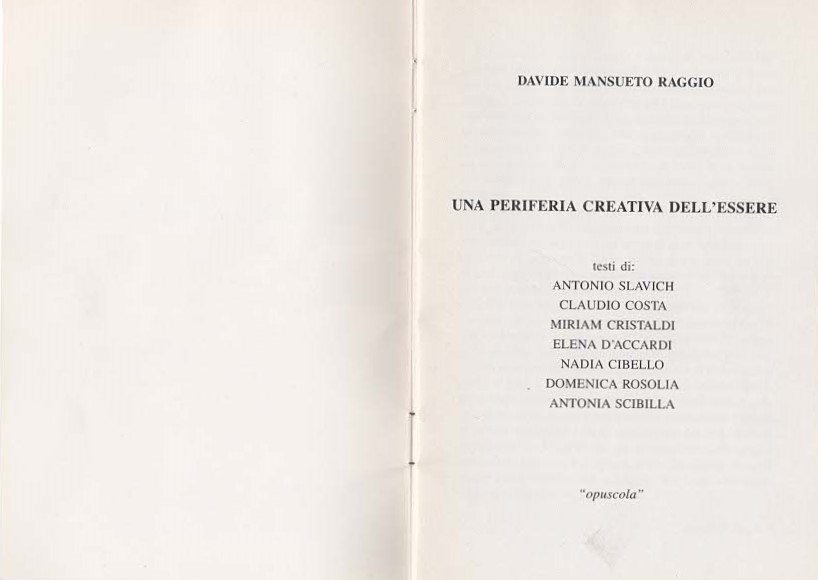 da boscaglia in combattimento col vento e con le acque”, la serie dei Pinocchi di legno e bambù innestati su molle di ferro, le silhouettes dipinte su cartone con l’argilla (il suo “sassomatto”) e la cenere di sigaretta. La sua utopia è, e resta, semplice: «Morire al mondo sensibile per rinascere col Corpo dell’Arcobaleno». Ogni persona, per Davide Raggio, ha “i suoi consonanti, i suoi risvolti, disinvolti”. Ed è lui, ancora, che afferma, senza più dubbi: «Andare con l’immaginazione, di non poter più andare… e allora va la corriera, va lo stesso, anche senza autista!».