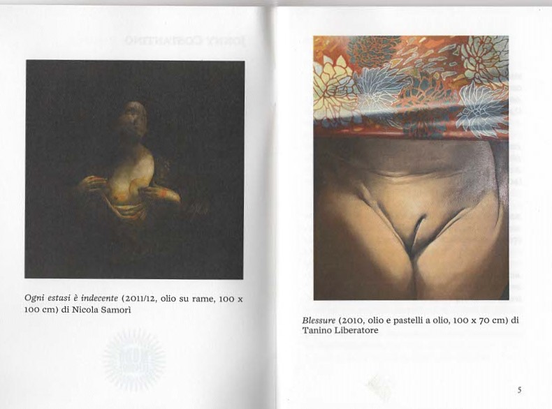 Vengo al punto: cosa vuol dire che ogni estasi è indecente? Ebbene: ogni estasi è indecente nella misura in cui rivela ciò che in nuce e in sboccio è: un amplesso. Un amplesso fusionale tra la sindone e l’assorbente, tra il segreto e il secreto, tra il dogma e il magma, tra lo stigma e lo smegma. Ogni estasi è indecente nella misura in cui ci ricorda che elevazione fa rima con abiezione come gioia con foia, e che sacrale è sia l’aggettivo di sacro sia dell’osso confinante con la regione anale.