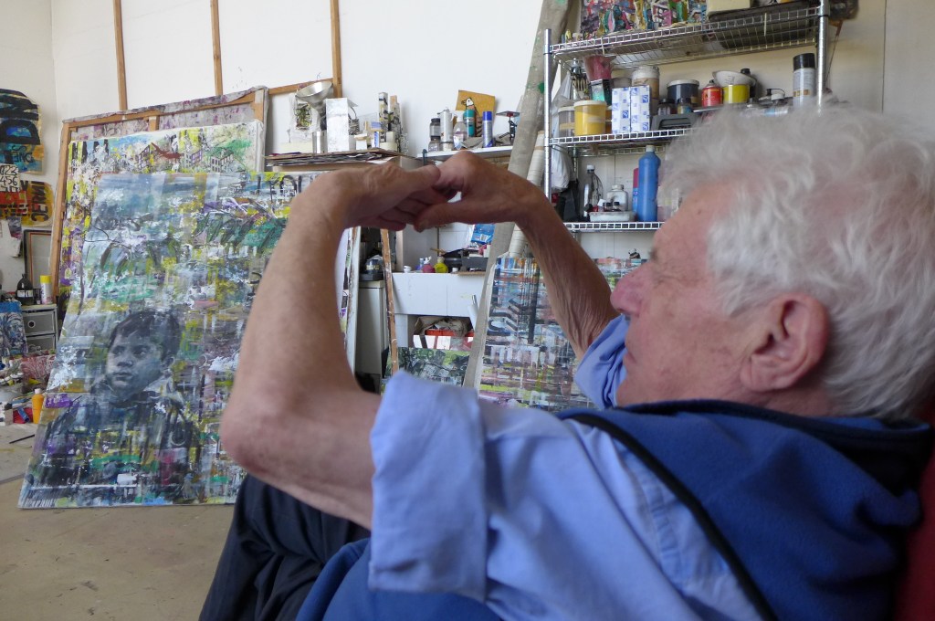 «Quel pomeriggio di giugno del 2015 – John morirà il 2 gennaio del 2017, diciotto mesi dopo – insieme ai lavori di Rostia e al suo modo straordinario di mostrarceli, mi incanto a guardare come John li guarda e come Rostia guarda John che li guarda. Di parole ne passano pochissime. Sembrano due muratori o due boscaioli al lavoro, comunicano col corpo, con gli occhi e con le mani, mezzi più veloci e meno ambigui delle parole. Non si fa così sui cantieri o nelle foreste quando si abbattono gli alberi? Nell’atelier di Rostia regna un silenzio assoluto, come se la voce fosse inaffidabile o troppo lenta rispetto all’attenzione che l’opera in corso richiede. Forse l’unico effetto acustico lo produco io, spostandomi per fotografare quel loro dialogo fatto di gesti e di occhiate e, di tanto in tanto, di uno dei grossi sospiri di John. Rostia sposta le sue tele, spesso molto grandi, come se fossero rami d’albero, ci cammina sopra, le calpesta, le fissa a un telaio ligneo con una pinzatrice che spara punti metallici con un rumore secco, sovrapponendole le une alle altre. Inevitabile pensare al feticismo mercantile delle gallerie, dei musei, dei collezionisti. Qui le opere sono corpi viventi, in trasformazione, esposte alla luce, al freddo, alla suola delle scarpe del loro autore, alla sua amorosa disattenzione, simile a quella di chi non tratta il proprio cane come se fosse un figlio. Non gli importa del loro valore e del loro nitore, ma della loro energia, della loro possibilità di continuare a evolvere e di farsi ascoltare».