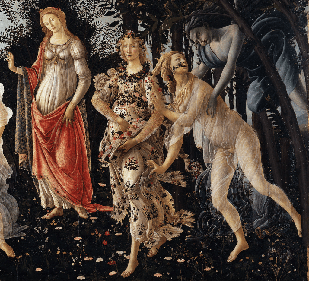 Nella Primavera Flora è la ninfa fecondata dal vento Zefiro che sparge fiori a simboleggiare l’arrivo della bella stagione. La dea, secondo Warburg, è Simonetta Vespucci, amante del fratello del Magnifico, morta prematuramente all’età di ventitré anni. Attraverso le coeve testimonianze letterarie, a cominciare dal Poliziano per finire al Magnifico, Warburg si rende conto dell’effetto devastante che suscitò la morte della ninfa Simonetta. La Primavera, o per meglio dire “Il regno di Venere”, sarebbe stato dipinto per la sua morte: Venere ammonisce severamente lo spettatore quasi in segno di lutto. Flora/Simonetta, in veste di Proserpina, annuncia il ritorno alla vita dopo la morte invernale. Nell’opera appare “non solo Simonetta idealizzata a ‘ninfa’, bensì anche la riproduzione dei suoi lineamenti” (4). Lo si comprende confrontando le fattezze di Flora con due ritratti di Simonetta dalla fantastica “acconciatura da ninfa” (5). Il Poliziano l’aveva già ritratta nelle Stanze per la giostra di Giuliano de’ Medici come ninfa in fuga in un inseguimento erotico, i panni sottili e svolazzanti in rapido movimento.