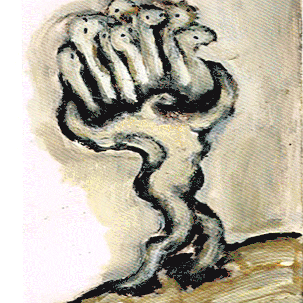 Vivere tranquilli sapendo di cose oscure. Scrivere appunti nella penombra, quando non è neppure visibile il foglio, quando tutto è scollegato dalla volontà. Sa che i danzatori girano su se stessi, che paralizzano gli ascoltatori col movimento rotatorio dei corpi. Sa che la veglia sfocia presto nel sonno, e la tollera per questa fugacità. Sotto il cappuccio nero, l’uomo ha una faccia stravolta, senza lineamenti definiti, e regge un piffero strano, che incute molta paura. Ha visto delle scimmie, nei sogni di tarda notte, e sopra la fronte delle scimmie dei piccoli scheletri, forse di bambini, forse di dinosauri. Spesso si trova con una seconda, piccola testa che gli pende dalla fronte sopra gli occhi, e lo guarda dentro le pupille.