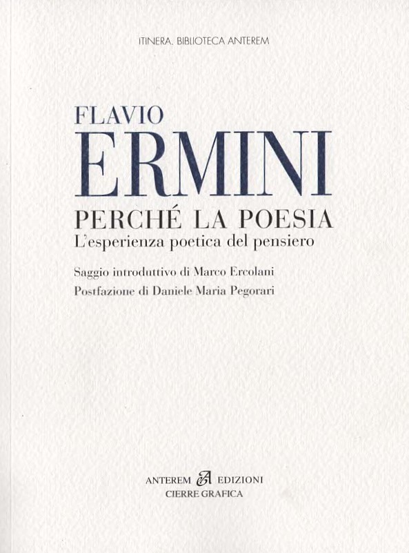 Ermini, concludendo l’avventura di una rivista come Anterem, scopre il “momento appena accennato di una danza”. Quello che definisce “un altro mondo dietro le apparenze” è, ancora una volta, “il velo nero del pastore” che, come nell’omonimo racconto di Hawthorne, ci indica che dietro il velo non c’è nulla se non l’emozione di ricominciare a vedere il mistero, il rinnovarsi della parola oltre ogni assillo temporale. Quella “risonanza tra l’opera e noi” è ancora una volta la germinazione di una lingua che, nel terreno dell’assenza, ribadisce la presenza di chi veramente vive oltre e fuori dal mondo dei codici prestabiliti e dei sensi prevedibili. Niente di sicuro abita l’abisso della poesia se non la certezza dello scacco al linguaggio comune che introduce a un nuovo battesimo delle cose. Il pensiero circolare di Ermini prevede una vita sempre avvolta nella consapevolezza della fine. Ma la fine relativa dell’uomo è contrassegnata dall’assoluta libertà della poesia che lo abita, in un gesto apollineo e dionisiaco che trascende le apparenze sensoriali.