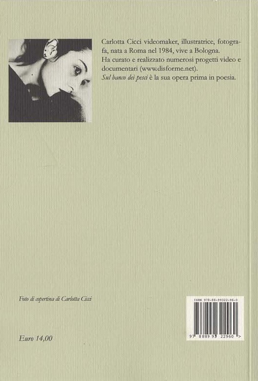 Carlotta Cicci, videomaker, illustratrice, fotografa, nata a Roma nel 1984, vive a Bologna. Ha curato e realizzato progetti video e documentari (www.disforme.net). Sul banco dei pesci è la sua opera prima in poesia.