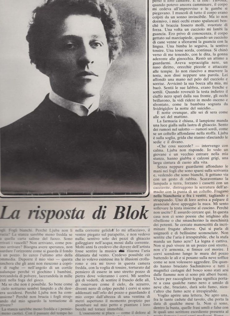 Io leggo, in qualche gazzetta, tiepide lodi al mio ultimo libro, plausi incerti e perplessi. Un critico attento giudica Mattina grigia un volume postumo. Non posso che concordare con lui: io volevo mettere assieme le poesie giovanili per dimostrare ai miei lettori che sono morto e che rivivere è impossibile. Non tormentatemi, lasciatemi tacere. Sono così stanco, in certe giornate, che dimentico quale colore avessero gli occhi di Ljuba ed è atroce per me, non ricordare che erano di un magnifico azzurro. I giorni della felicità e della rivolta sono rumori del passato. Dietro la marcia malferma dei rivoltosi, Cristo era solo uno spettro disegnato nell’aria da fiocchi di neve. Adesso, spente le fiamme degli incendi, il cielo è grigio La Nevà un fiume solcato da blocchi di ghiaccio. I cavalli che galoppano fra i canali non emettono un nitrito. La mia poesia è uno strumento troppo fragile – un violino forse? – spaccato da un colpo di zoccolo. La cassa è sfasciata, le corde recise, l’archetto giace nella neve. La musica è sparita e restano cadaveri privi di senso, la legna non brucia e riempie dii fumo la stanza, che aria irrespirabile, le adunate, le perquisizioni, i sequestri! Ljuba è invecchiata e litiga con mia madre. Io ho fame e quando scendo da letto mi muovo lentamente, una mano premuta sul cuore. Il poeta muore perché non ha più aria da respirare e la sua vita è priva di senso. Non è stata la pallottola di D’Anthès a uccidere Puskin ma la mancanza d’aria. Mia moglie mi sveglia alle due di notte e dice che lancio urla agghiaccianti. La mia casa è stretta come un pozzo. Il soffitto mura l’orlo del pozzo. A una lettura di versi, nello scantinato di un ristorante fuori uso, un giovane altezzoso parlava delle poesie di Blok dicendo che erano state scritte da un cadavere. Io, nascosto dietro la schiena di un amico, sorrisi.