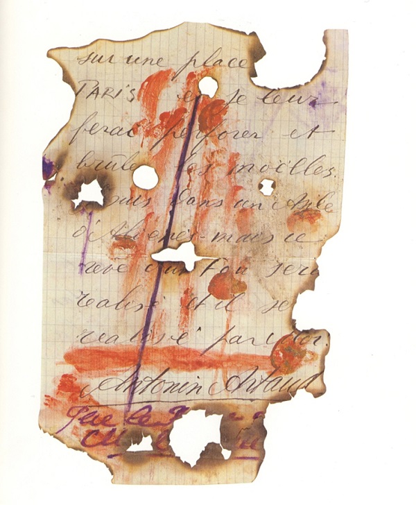 Artaud è un grande devastato che, guardandosi bene dal voler uscire dalla sua devastazione, fa di questa la propria lingua. È, dice di essere, colui che parla il linguaggio del suo incendio. Mentre brucia, si fa voce della sua bruciatura e, attraverso di essa, intensifica la propria umanità. È spettatore della sua carne in preda al fuoco, spettatore non lontano e tuttavia abbastanza lontano da potere osservare il tutto dall’alto, sulla sua fiamma danzante, mentre la mano traccia in un unico movimento l’atto che brucia e la visione che alimenta il fuoco. La mano traccia il diagramma verbale di questa duplice attività, non scrive ma registra il fenomeno alla sua velocità. Non appartiene al leggibile, ma al vivente e all’attimo così come nasce e grida. La grafia dei quaderni è l’impronta stessa della vitalità di Artaud mentre vive il suo incendio. Non potevano essere “scritti” che in questo modo – in questa scrittura obbediente alla pulsioni e non alla calligrafia. Il senso è nel movimento, prima che nelle articolazioni della frase. Mettete a confronto tutto questo con dei libri editi: la massa della scrittura si è trasformata in un testo chiaramente organizzato, con un ricco corredo di note. L’illeggibile è diventato leggibile. Un tradimento?