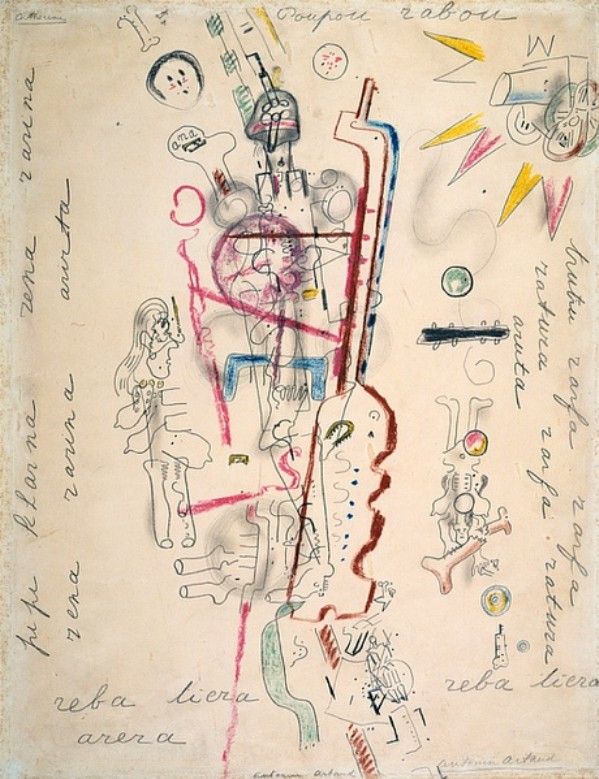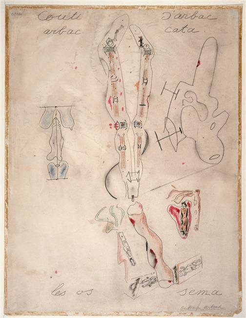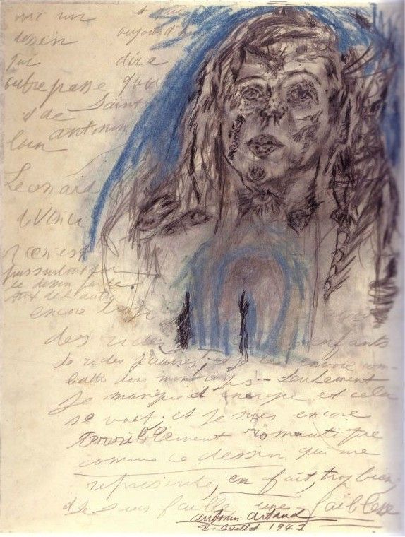 Lo trasporta nel teatro di cui diventerà (ma in un altro tempo di quello esistenziale) uno dei teorici più ascoltati grazie ai testi raccolti nel Teatro e il suo doppio. Un teorico, però, involontario, dato che dal suo libro si estrapolano un’estetica e delle regole, mentre lui mirava a una rifondazione anatomica. Quando il libro appare in quattrocento copie, Artaud è internato. Dal 1938 al 1943 subisce un ricovero che lo esclude dal suo mondo, con privazioni così severe da distruggere la sua vitalità. È l’epoca in cui si era pianificata la morte per fame per migliaia di alienati nei ricoveri. Infine, l’11 febbraio 1943, grazie all’intervento di Desnos presso il dottor Ferdière, Artaud viene trasferito a Rodez. È nutrito meglio ma subirà quattro serie di dodici elettroshock, un vero supplizio terapeutico seguito da lunghi stati comatosi, di cui uno rischiò di ucciderlo. Le lettere scritte in quel periodo, come le traduzioni di Lewis Carroll, provano che Artaud è ancora in grado di esprimersi, ma in una lingua di pena, una specie di ultimo anelito. Tutto cambia a partire dal 1945: Artaud decide di ri-animarsi con un accanimento che non defletterà più e si traduce in scrittura (taccuini di Rodez) e in disegno. Artaud non scrive e disegna come si scrive e si disegna normalmente: lo fa in modo così eccessivo e costante che ne risulta un riversarsi del quotidiano nella grafia che lo raccoglie e registra. Questo è simile a un getto verbale. Un getto in cui si distinguono delle serie di assonanze che si richiamano, si succedono, si completano. Tessitura sonora che domina il senso e spesso lo fa deviare, precipitare. Si segue la pulsazione di un pensiero che avanza, non per concatenazioni, ma per associazioni sovrapposte. Tutto questo genera frasi dove il ritmo è più determinante della sintassi: frasi di slancio, cadute, interruzioni, contrazioni violente. Ma si avverte quest’unica cosa: la letteralità dell’atto di pensare.