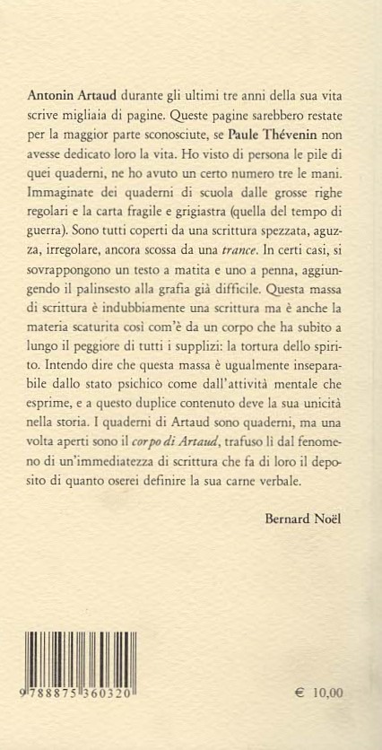 «Antonin Artaud durante gli ultimi tre anni della sua vita scrive migliaia di pagine. Queste pagine sarebbero restate per la maggior parte sconosciute, se Paule Thévenin non avesse dedicato loro la vita. Ho visto di persona le pile di quei quaderni, ne ho avuto un certo numero tra le mani. Immaginate dei quaderni di scuola dalle grosse righe regolari e la carta fragile e grigiastra (quella del tempo di guerra). Sono tutti coperti da una scrittura spezzata, aguzza, irregolare, ancora scossa da una trance. In certi casi, si sovrappongono un testo a matita e uno a penna, aggiungendo il palinsesto alla grafia già difficile. Questa massa di scrittura è indubbiamente una scrittura ma è anche la materia scaturita così com’è da un corpo che ha subito a lungo il peggiore di tutti i supplizi: la tortura dello spirito. Intendo dire che questa massa è ugualmente inseparabile dallo stato psichico come dall’attività mentale che esprime, e a questo duplice contenuto deve la sua unicità nella storia. I quaderni di Artaud sono quaderni, ma una volta aperti sono il corpo di Artaud, trasfuso lì dal fenomeno di un’immediatezza di scrittura che fa di loro il deposito di quanto oserei definire la sua carne verbale». (Bernard Noël)