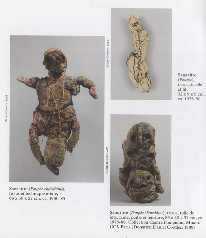 Era per raccoglierle… l’informe della forma… senza dubbio sì, sennò tutto era flaccido. Al contrario, con il nodo, volevo far presto a raccogliere le materie. Io cucio, di quando in quando, di solito con grossi aghi perché le materie erano dure e spesse da traversare, impenetrabili… Io ero in un tale stato, nella transe del lavoro, che non vedevo quello che facevo. L’ho chiamato “bambola” ma il procedimento andava ben più lontano… penso che in fin dei conti non ho mai confezionato bambole, nel senso del loro uso comune. La bambola, nel mio universo personale, è un desiderio: ciò che creo è la conseguenza della bambola vietata, è un atto trasgressivo. Al di là della bambola: confesso che non avevo mai pensato niente prima. Verso il 1980 ho fatto un’esperienza mistica immergendo la bambola in questo “bagno rituale”: fu molto breve ma mi afferrò il panico. Non ero più io. Descrissi questa esperienza mistica nelle mie conversazioni co Françoise Mounin: «Io ero un mille-foglie che traversavo, sentivo che traversavo divani di materia, vegetale, animale…ero quasi arrivato al “nucleo”. Ebbi così tanta paura che tolsi via la bambola».