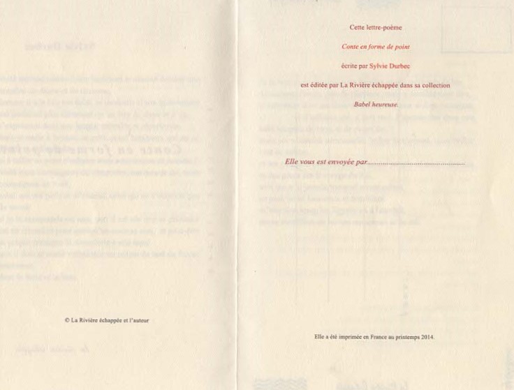 *I due testi sono tratti da: Sylvie Durbec, Conte en forme de point, la rivière echappée, 2014.