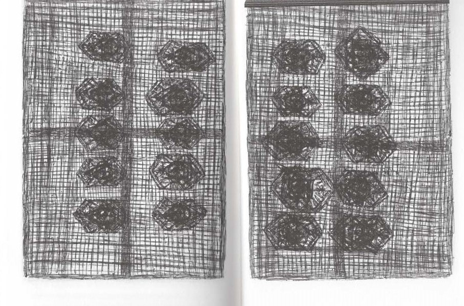 I fogli (in generale 21 + 29,5 cm) venivano utilizzati su ambedue i lati, recto e verso, la maggior parte è saturata dai motivi grafici, essendo il supporto limitato e il desiderio di esprimersi vivo e irreprimibile. Coniugando scrittura e figura, il creatore si abbandona a sperimentazioni dove a volte dialogano e si intrecciano forme astratte e simulacri di scrittura. Cerca il valore del segno e la forza pittografica delle lettere, tralasciando il significato. Stelle, croci, cerchi, ovali, poligoni vari sono allineati all’infinito, giustapposti in uno sciame che sembra senza fine, come se ogni figura fosse generata dalla precedente e invocasse instancabilmente la nascita della successiva. Il flusso grafico pare seguire un rimo iterativo lancinante, favorevole all’ispirazione dell’autore che vi vede un rilancio della propria creazione. Le linee ripetute più volte e spesso sovrapposte, come un filo di inchiostro nero che si snoda instancabilmente sulla pagina bianca, esercitarono senza dubbio anche un intenso effetto ipnotico sullo scrittore-disegnatore, inducendolo a staccarsi dalla realtà per entrare in uno stato psichico altro, prossimo alla trance.