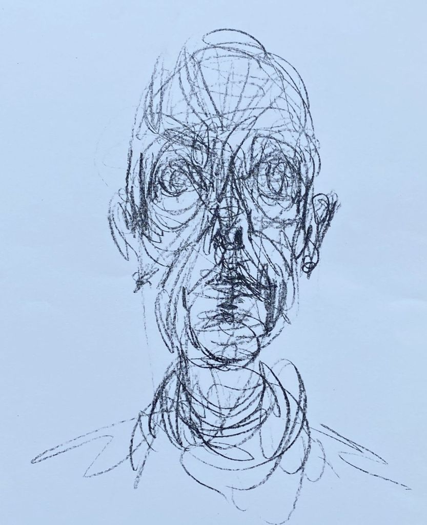 […] Il volto appare come l’area di una lotta senza esclusione di colpi. È lì che si gioca la partita, che l’interrogazione forsennata dello sguardo si esercita, che lo strumento più preciso, occhio e pennello confusi, deve agire con pazienza e altrettanta crudeltà. La presenza immediata impone la rapidità, la violenza dell’attacco e della penetrazione, ma la definizione della distanza implica un approccio meticoloso. Senza moderare il suo furore, questo strumento contraddittorio è alla ricerca, talvolta per notti intere, di una sola linea introvabile. La lotta conosce alti e bassi, successi e rovesci. Da un giorno all’altro il ritratto svanisce, riappare, si cancella di nuovo, resuscita ancora senza che nulla permetta di prevederne l’esito. Inseguimento incessante tramite ripetute contestazioni, il tratto si somma al tratto, lo oblitera e progredisce. Innumerevoli tatti che non circoscrivono né precisano alcunché, ma che fanno sorgere qualcosa. Più che nei disegni la linea si dissolve, si sminuzza, si sparpaglia in segmenti che si confondono con i tocchi. Moltiplicandosi e dividendosi, i tratti sembrano annullarsi reciprocamente e sparire davanti alla totalità di una testa che scaturisce spontaneamente dal vuoto […]
