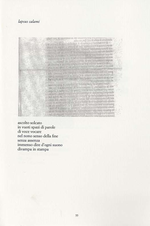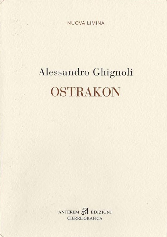 Ostrakon (da cui “ostracismo”) è una forma epigrafica di scrittura che designava la procedura di “messa al bando” di persone ostili al potere costituito. Alcune poesie, dedicate alla follia come a una “dialettica ordinata”, sono paradossalmente le più limpide e lineari del volume. Sottolineo la natura beffarda (ludica ma beffarda) con cui Ghignoli dispone nel libro, con raffinata intelligenza di auctor, poesia linguistica e poesia visiva, vivendo “nel dentro più dentro queste parole”, scherzando il lettore e costruendo, contro di lui e per lui, un sardonico epitaffio alla poesia come genere letterario: “immune in me insieme / nei miei me stessi me”, il poeta appare disperso dentro le parole come in una visione dislocante e ultraumana che evoca la forma del libro: “nel nono senso della fine / senza assenza / immenso dire d’ogni suono / divampa in stampa”. (M.E.)