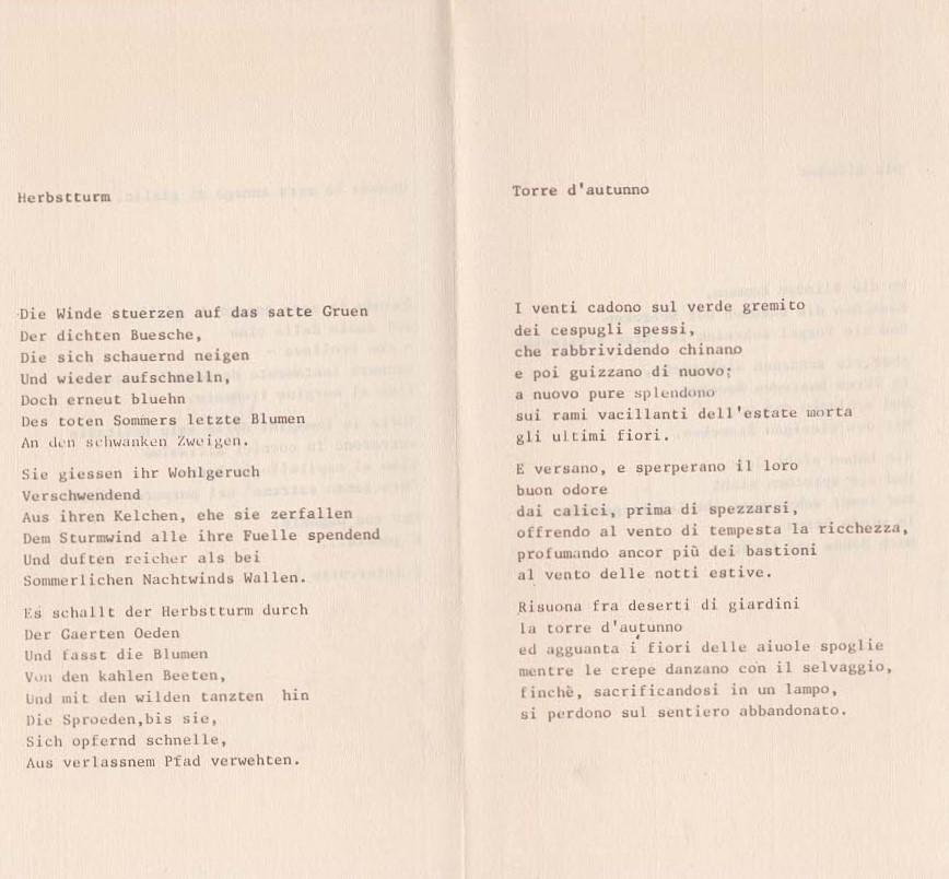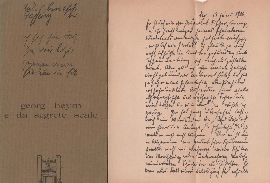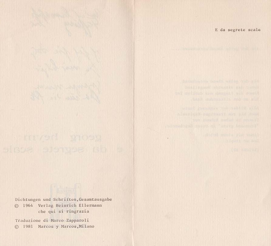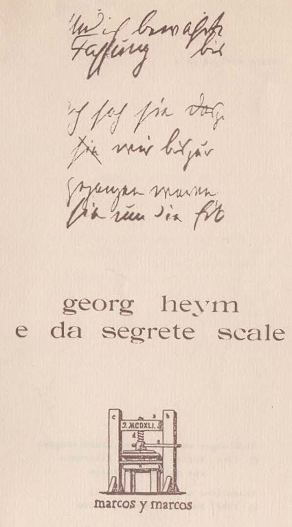 «È stato un piccolo libro E da segrete scale di Georg Heym, un poeta espressionista tedesco del primo novecento, morto nel 1912 a soli venticinque anni, pressoché dimenticato dall’editoria italiana. Una raccolta di poesie di 16 pagine, autotradotto, stampato tipograficamente su carta pregiata, piegato a mano, e splendidi caratteri Garamond; 400copie che abbiamo portato di persona in dieci librerie. Costava mille lire. La poesia che dà il titolo alla piccola raccolta la so a memoria, mi torna in mente in moltissime occasioni: “Di nuovo entriamo ora nel sole, dal campo d’oro e da segrete scale…».