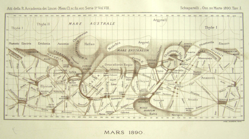 Io, Giovanni Virginio Schiaparelli, astronomo, ho scoperto, con l’ausilio del telescopio, che sulla superficie visibile del pianeta Marte esistono dei canali regolari, disposti con mirabile armonia come raggi di figure geometriche. Già la certezza scientifica che il pianeta sia irrigato da fiumi e corsi d’acqua smantella per sempre la presuntuosa convinzione umana che la terra sia l’unico pianeta fecondo e abitato da esseri vivi. Marte, come dimostrano le mie rilevazioni, non è né un astro rossastro e sassoso né un grezzo vulcano inattivo, abitato da mostri a tre teste e da diaboliche chimere, ma, al contrario, il regno di una civiltà agricola, forse più felice della nostra, che coltiva il suolo per ottenere piante bellissime, frutti profumati e nutrimento per i figli.