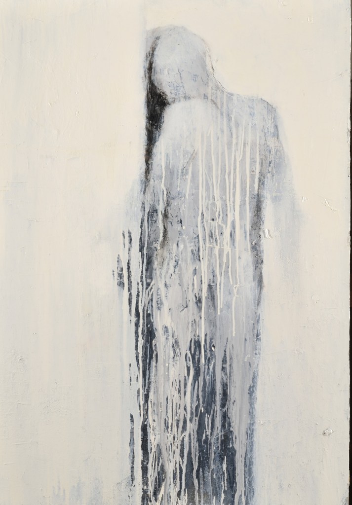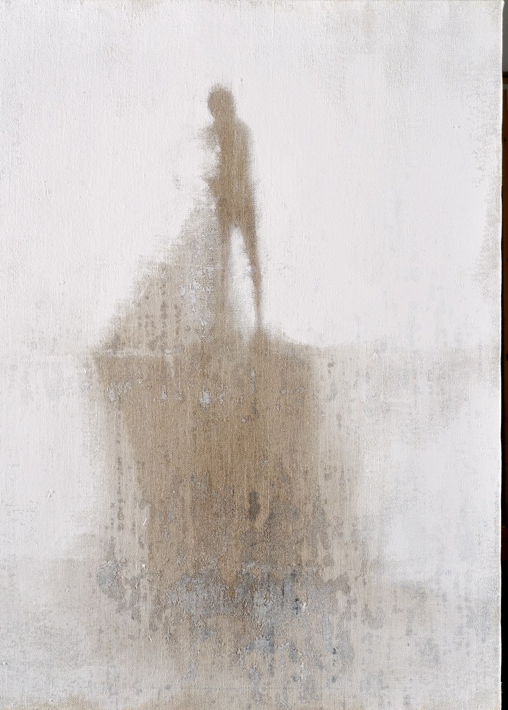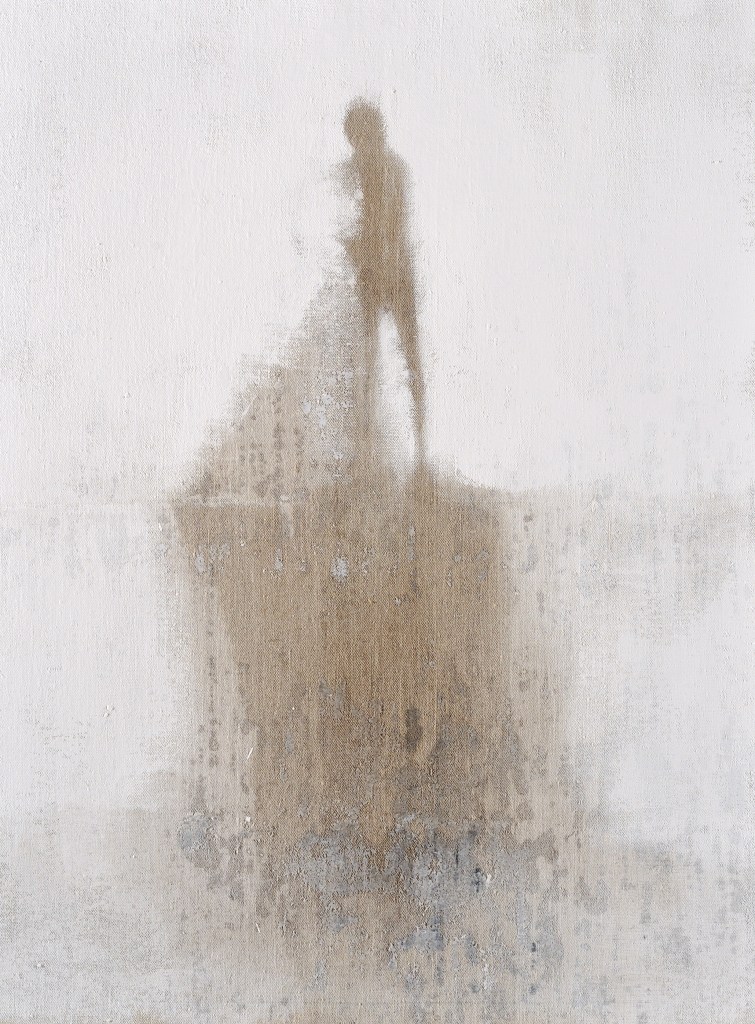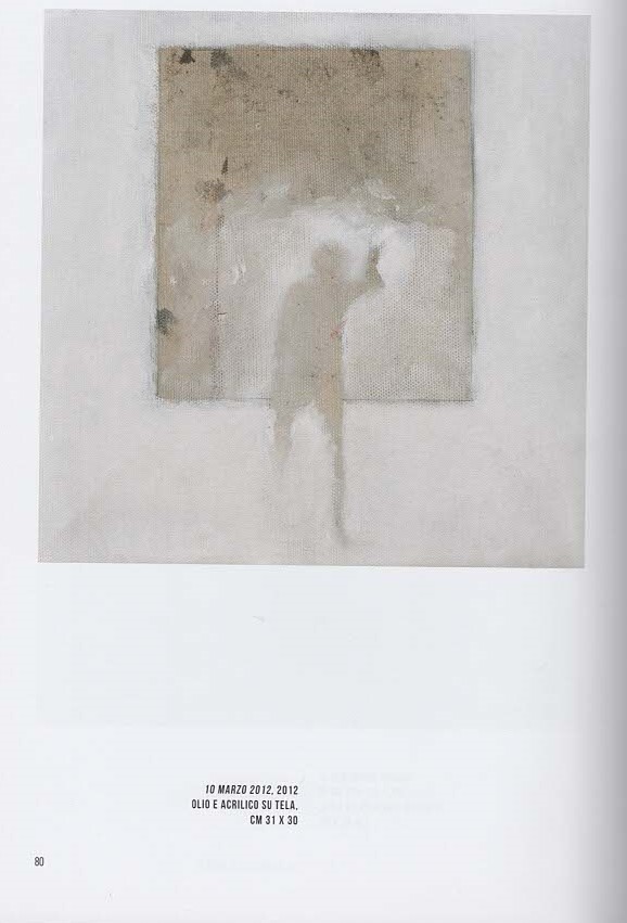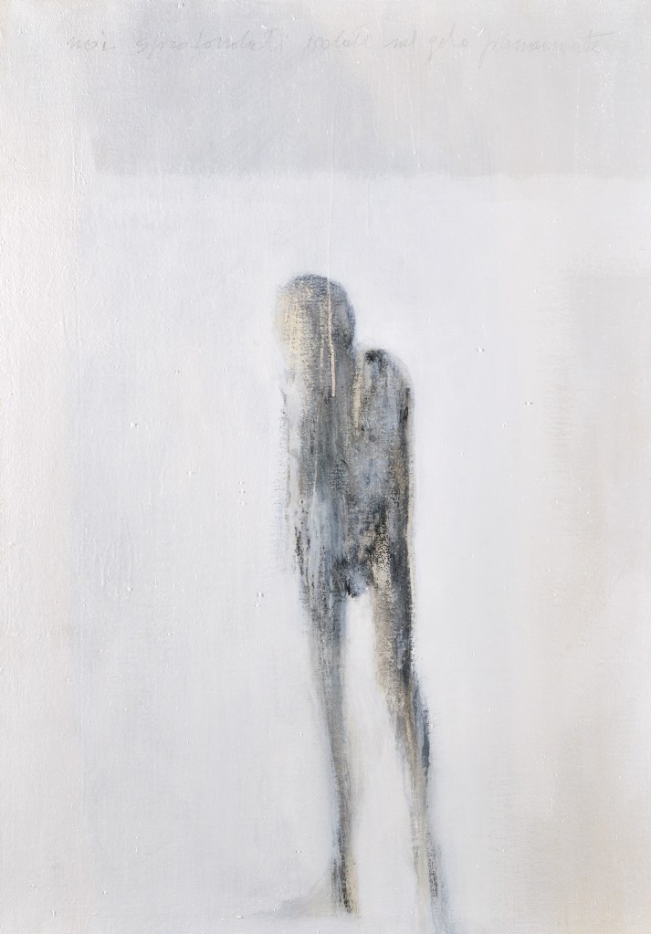 Da alcuni anni un altro grande poeta è diventato il riferimento letterario della mia ricerca pittorica, Paul Celan, che scrive: “È il mondo in cui ci è dato vivere, con tutto quanto in esso è accaduto, a investire di una luce paradossale l’arte, a sconvolgerne il pacifico esercizio, a condurci a una contestazione delle stesse ragioni di esistere dell’arte… Cosa accade se l’aria ci viene sottratta o si fa irrespirabile? Il respiro diventa rantolo, esso basta ormai soltanto per un grido. Non più discorso ma grido. Il grido diventa parola strozzata in gola, diventa infine silenzio”. Nei miei attuali lavori appaiono fantasmi ammutoliti che si accampano sull’orlo di se stessi, tra un “non più” e un “pur sempre” nel bianco. “Quando il bianco ci aggredì” prospetta un lento, progressivo sprofondare in quella “neve” che è diventata la gelida allegoria della dimensione irrecuperabile in cui sta cancellandosi la testimonianza, la memoria di un’umanità tragica.