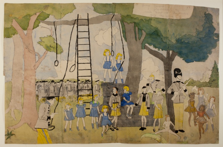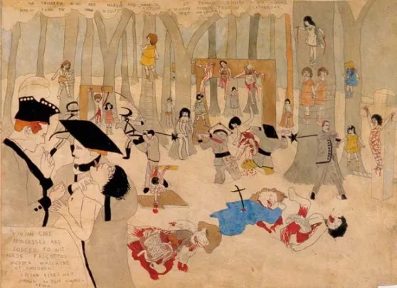 Ci sono però anche casi di artisti che si sono chiusi nel proprio mondo interiore al punto da tenerlo nascosto agli occhi degli altri. Pensiamo all’americano Henry Darger. Rimasto, durante la prima infanzia, orfano di entrambi i genitori, frequenta una scuola cattolica, ma il suo comportamento poco rispettoso delle regole fa sì che nel 1904, quando ha solo dodici anni, venga recluso nell’Illinois Asylum for Feeble-Minded Children, famoso per il severo trattamento che infligge ai ragazzi. Qualche anno dopo, Darger riesce a fuggire e a tornare nella propria città natale, Chicago. Lì trova impiego come inserviente o lavapiatti presso vari ospedali, lavoro che svolgerà fino al pensionamento. Nel tempo libero, raccoglie ogni tipo di oggetti di scarto, ma in particolare riviste e fumetti. È solo quando, nel 1972 (un anno prima della morte), viene trasferito in un ospizio, che i proprietari del modesto appartamento in cui abita da decenni scoprono, con sorpresa, il frutto del lavoro da lui effettuato in segreto. Si tratta di vari lunghissimi scritti, tra cui spicca un’opera narrativa, The Story of the Vivian Girls in the Realms of the Unreal, che supera le 15.000 pagine ed è accompagnata da più di trecento illustrazioni, spesso di grande formato9. La vicenda narrata nell’opera è quella delle Vivian Girls, le sette giovanissime principesse del regno di Abbieannia, che si ergono a difesa delle bambine, battendosi assieme a loro contro un esercito invasore che le ha schiavizzate. Nelle immagini, che sono perlopiù disegni colorati ad acquerello, scene idilliache si alternano ad altre assai cruente, nelle quali le piccole ribelli vengono sventrate, strozzate o impiccate dai feroci militari. In certi casi, le bambine sono raffigurate nude, e spesso dotate di un piccolo membro maschile, sicché l’insieme oscilla tra naïveté e ambiguità sessuale. Per realizzare le illustrazioni, che costituiscono la parte più significativa della sua opera, Darger utilizza anche una tecnica insolita, ossia ricalca figure da giornali o fumetti e le riporta sui fogli, colorandole. Nel loro insieme, i dipinti su carta, ricchi di personaggi e affascinanti per la loro potenza visionaria, hanno suscitato interesse e ammirazione nei cultori di quella che, a seconda dei paesi, viene definita art brut oppure outsider art (Giuseppe Zuccarino).