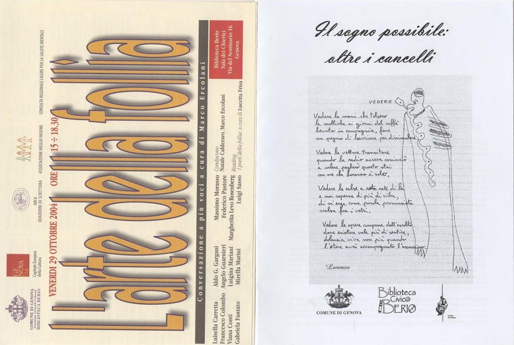 Con Marco Ercolani cura progetto grafico e mostra (I SEGNI POSSIBILI), all’interno del convegno: “Tra follia e salute. L’arte come evento”, Villa Comago di S. Olcese, Graphos editore, 2000.