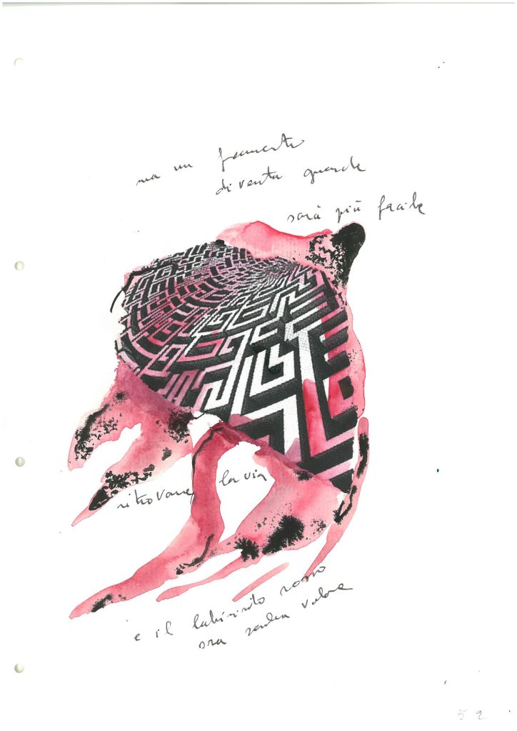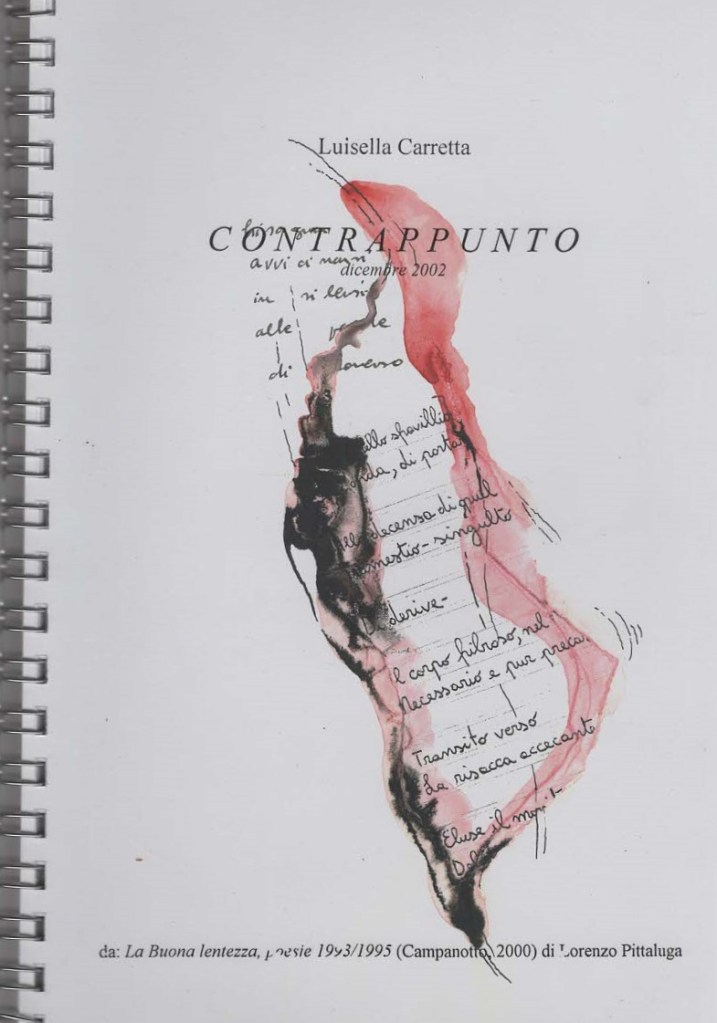 Nel 2002 Luisella Carretta elabora questo quaderno, in omaggio a un poeta schizofrenico morto suicida, Lorenzo Pittaluga (1967-1995): CONTRAPPUNTO, da frammenti di poesie di Lorenzo Pittaluga, Genova, pag. 46, 21×30 cm., disegni e testi, xerox su acetato e collage, inchiostri e acquerello su carta. In: https://ercolani.art.blog/2021/09/03/contrappunto/