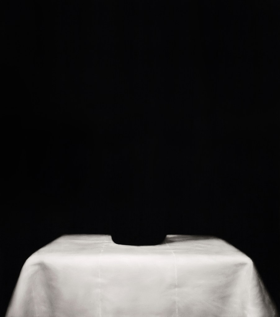 Il fondo bianco della tavola – che io provo a modellare quasi fosse una sostanza plasmabile – diviene allora luminoso solo grazie alla pittura e all’inscindibile materia del nero.