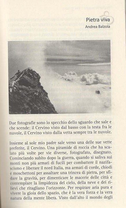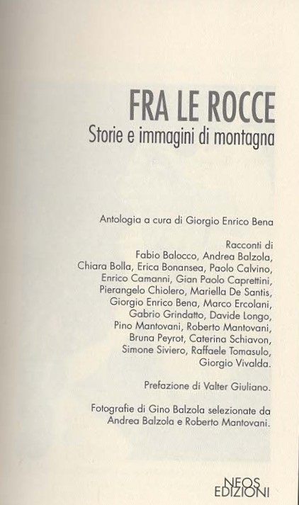 Questo volume, ideato da Andrea Balzola e Silvia Maria Ramasso, è curato da Giorgio Enrico Bena, e dedicato a Gino Balzola, fotografo e pittore, nel quarantennale della sua morte, Le sue fotografie, artistiche e di montagna, scattate negli anni Cinquanta del secolo scorso, tra le Alpi piemontesi e le Dolomiti, hanno ispirato i racconti di venti scrittori.,