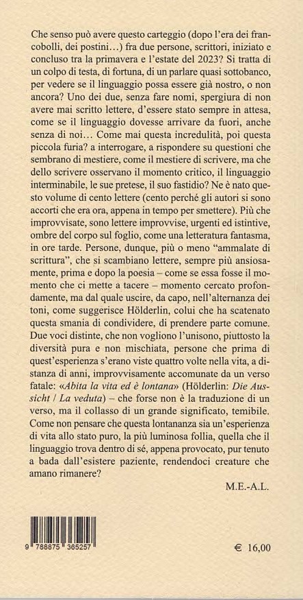 Cento lettere è un libro straordinario perché fornisce un’occasione unica: seguire, nella vita e nella ricerca sulla poesia per un periodo di alcuni mesi, due scrittori in “presa diretta”. Lettere, come dice la quarta di copertina, “improvvise, urgenti ed istintive, ombre del corpo sul foglio, come una letteratura fantasma, in ore tarde”. Nello spedirmi il testo, Angelo mi aveva consigliato di “piluccare, come fanno gli uccellini, un po’ qui, un po’ là.” Non ci sono riuscita e secondo me è meglio, perché anche se alla fine quello che più mi ha colpito, e che cercherò indegnamente di descrivere, è solo uno dei mille filoni che si intrecciano in questo lavoro, la cosa più interessante è il disegno sottile della storia che giorno dopo giorno le lettere sono andate costruendo.