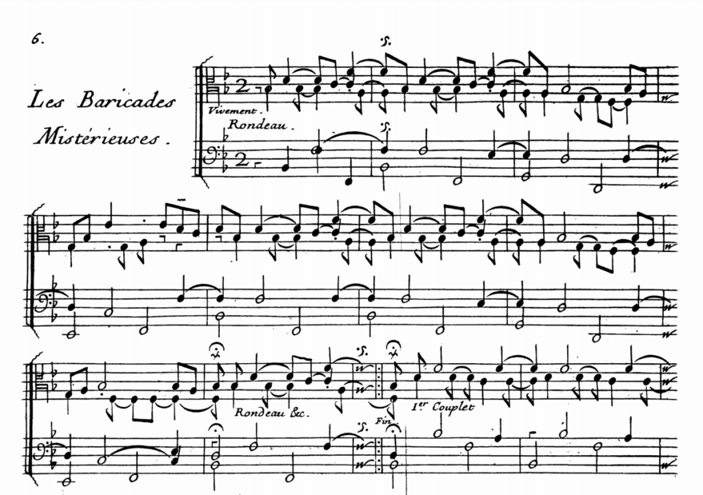 Sol minore. Rondò. Da eseguire vivement. Come altri hanno fatto prima di me e faranno dopo di me, senza porsi inutili problemi. Bravi esecutori. Musicisti precisi, che suonano con monotona efficacia L’Olimpique o L‘Insinuante, La Seduisante o Le Bavolet flotant. Ma per me non è così. Io sono un clavicembalista di scuola italiana. Sono nato a Padova, ho ventinove anni e mi hanno insegnato a essere tanto scrupoloso quanto passionale. E questo rondò, il quinto del Sixième Ordre, genera nel mio spirito una singolarissima attrazione. Devo suonarlo lentamente, perché è un tema semplice, ripetibile. Né malinconico né allegro né grazioso: ma ipnotico, magico, imperscrutabile. I diversi couplets lo ripetono, in un morbido sol minore, senza evidenti variazioni. Ma, ogni volta che smetti di eseguirlo, devi eseguirlo ancora, perché qualcosa non è andato come doveva, perché un incantesimo ti spinge a suonarlo di nuovo, lentamente, misteriosamente, perché il tema ti chiama, ti vuole, ti cerca ancora, non ce la fai a districarti, a liberarti completamente. E poi, quel titolo strano, che non puoi spiegare in nessun modo – Barricades Mystérieuses…