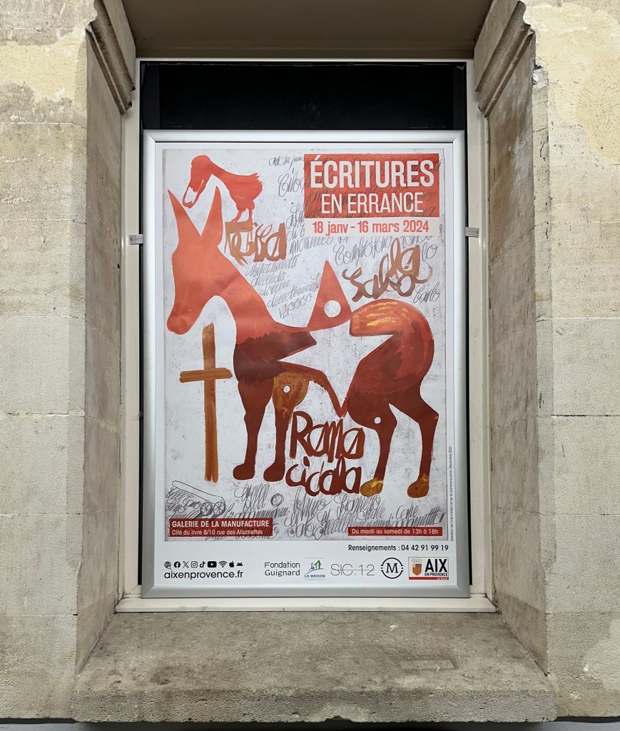 Écritures en errance (Scritture erranti) è il titolo di una mostra allestita alla galleria della Manufacture d’Aix-en-Provence dal 19 gennaio al 16 marzo 2024. Ospita le opere di 52 artisti, da Damiano Albeni a Carlo Zinelli, da Giovanni Bosco a David Parsons, da Pascal Leyder a Yosi Ibrahim, senza escludere figure che appartengono ormai alla storia dell’arte, come William Hogarth, Jacques Caillot o Johann-Michael Püchler. L’esposizione fa parte di un progetto di ricerca dedicato a indagare gli aspetti plastici della scrittura nel mondo dell’arte iniziato da Gustavo Giacosa nel 2010; si tratta di una indagine condotta con l’ausilio del compositore Fausto Ferraiuolo e che ha già dato vita a diverse esposizioni: Noi quelli della parola che sempre cammina a Genova nel 2010, Paroles en marche a Tolone nel 2016 e Parole in cammino a Roma nel 2022. Quali, possiamo chiederci, le ragioni che sostengono il progetto?