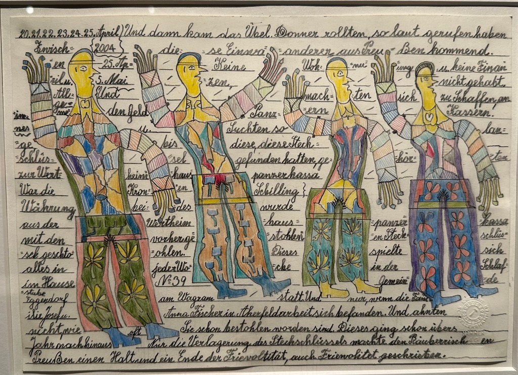 Occorre partire da una constatazione quasi ovvia. La comunicazione linguistica si fonda su vincoli grafici, grammaticali, logici. Si tratta di aspetti che nella vita quotidiana, all’atto della stesura di un testo, diamo per scontati, che accettiamo: anzi, a quelle regole ci guardiamo bene dal contravvenire. Le nostre scritture non si sottraggono nemmeno al rigore geometrico del supporto: le linee ortogonali che delimitano una pagina, il perimetro rettangolare dello schermo di un computer. Siamo confinati entro un foglio di carta, prigionieri tra i pixel alla stregua, ci ricorda Michel Thévoz, di “pesci in acquario”. Date queste premesse, è chiaro che una firma oppure una scritta sul muro ci possano talvolta apparire come eventi in grado di spiazzarci, come una forma di ritorno del rimosso. Thévoz, che sull’argomento è autore di un saggio importante, Les écrits bruts. Le langage de la rupture, ci avverte che proprio qui dobbiamo ravvisare il senso che la mostra ha da offrirci: aprire una prospettiva straniante, metterci nella condizione di accettare “incidenti provvidenziali”, “fallimenti riusciti”. Ma forse non si tratta soltanto di questo. L’orizzonte che l’esposizione di queste opere dischiude si rivela molto più ampio. E ci consente di intravedere un percorso, il progetto, appunto, di un itinerario, quello di un atto di ribellione tale – sottolinea Fiorella Bassan, che nel catalogo firma un breve testo intitolato Disfare la lingua ‒ da trovare nell’Art Brut un importante punto di approdo, ma da lasciarsi d’altro canto alle spalle una storia non certo breve: dalle decorazioni dei masoreti ai calligrammi di Apollinaire, dalle parole dipinte riportate alla luce da Giovanni Pozzi ai graffiti e alle altre invenzioni sperimentali di Jean Dubuffet. Una strada che, a volerla percorrere fino in fondo, ci porterebbe fin dentro le prove della poesia visiva, fino alle soglie di un’arte totale. Siamo in presenza, insomma, di “scritture inquiete”, di scritture vuote ma non per questo meno suggestive e significative; al contrario, proprio per la loro insofferenza a regole e convenzioni, capaci di scardinare, di ribaltare ottiche usuali. Anni fa, nel 2002, una mostra a Reggio Emilia, intitolata Alfabeti in sogno, aveva fatto emergere questa dimensione onirica, una sorta di inconscio del linguaggio. Ogni lettera, quale che fosse il codice alfabetico o culturale da cui scaturiva, si faceva immagine, spazio incognito e pertanto tutto esplorabile, dimensione libera e sfuggente. Comprendiamo allora di essere al cospetto di un campo fertile per l’arte, in cui ogni singolo artista (basterebbe pensare a quanto già compiuto, per fare solo qualche nome, da Gastone Novelli, da Marc Chagall, da Anselm Kiefer) avrà modo di elaborare la sua lingua, il proprio personale alfabeto, ciò che a noi si presenta, scrive Marco Ercolani (Codici alfabetici) come un “enigma verbale”, una “scrittura asemica”, talvolta persino come una “costellazione magica”. Lo stesso Ercolani in altre pagine del catalogo s’azzarda a indicare le possibili declinazioni di questo fenomeno, il suo arco di oscillazione. Da un lato si vanno a collocare il racconto intimo, il messaggio epistolare e dunque lo spazio della confessione: qui possiamo trovare le opere di Mateo Argüello Pitt, artista argentino, con i volti che affiorano dalla fitta trama della scrittura, fino a occupare e nascondere parte delle sue “calligrafie”; possiamo lasciarci catturare dagli intrecci di parole e immagini del belga Roger Angeli, dalle linee nitide e essenziali dei suoi disegni, dall’ossessiva ricorrenza di una scrittura che mira a costruire una soggettiva mitologia; possiamo ancora leggere i testi del tedesco Johann Fischer, parole sottolineate con un righello e poste in dialogo con disegni che raffigurano, con colori spesso vivaci, animali e persone. Sono, questi e altri, tutti tentativi, ci avverte Ercolani, di scrivere la propria ‒ frammentaria, interminabile ‒ autobiografia.