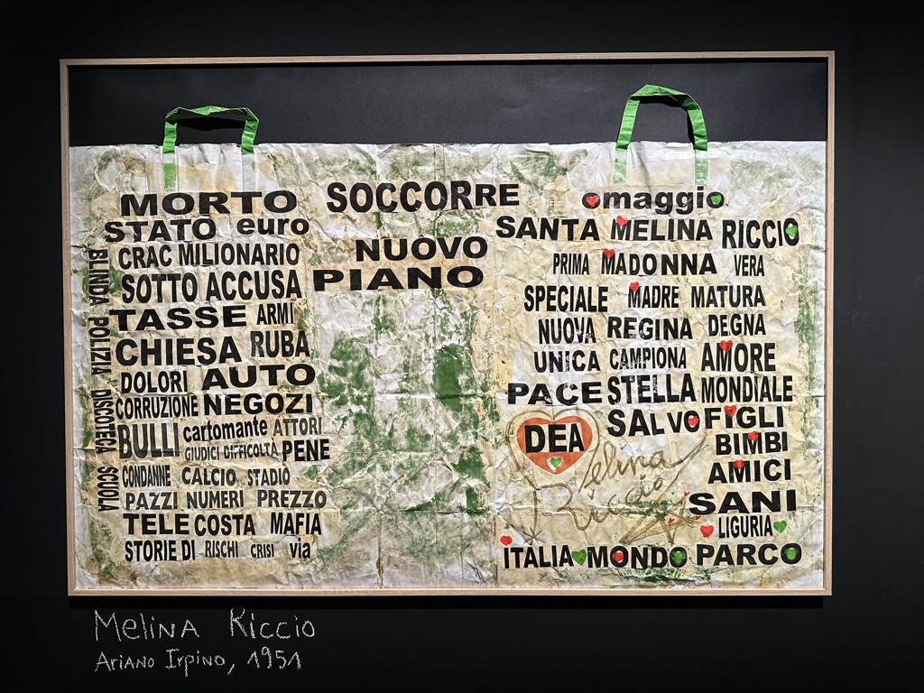 Sono osservazioni, appunti di lettura che finiscono per ricordarci come non di rado questa instabilità, quest’ansia di libertà creativa che attraversa segni e lettere, riconosca la propria origine anche in un disagio psichico, in una fisionomia patologicamente indocile. Ce ne offrono evidente testimonianza le pagine dei quaderni della genovese Maria T., che riversa il suo sofferto profilo esistenziale in collages e in parole tracciate in maniera regolare e ininterrotta; in quei fogli Maria affronta temi di natura mistica o profetica, mescola e mette a confronto religioni diverse, sonda possibili etimologie, astratte utopie. Si può in tal caso aprire uno spazio che nella mostra è stato delimitato col titolo di Preghiere, in cui tuttavia, ci informa Ercolani, non viene meno la dimensione di “una impossibile lotta”, cioè il tentativo, che trova nell’opera di Erik Darkenne un fondamentale punto di riferimento, di trascrivere “il proprio orrore interno come una preghiera rituale, con un gesto che esorcizza e rende visibile quell’orrore”. Si tratta di una sezione della mostra alquanto ricca, che ci consente quasi di compiere un viaggio nello spazio e nel tempo. Si può partire dal Giappone del XIX secolo, dal maestro della xilografia Utagawa Kuniyoshi, la cui arte, in stile ukiyo-e, “ha influenzato la cultura contemporanea dei manga, del cinema di animazione giapponese, dei tatuaggi e della cultura pop”. Si può proseguire il viaggio con Michel Nedjar, artista contemporaneo di origine algerina ed ebraica, la cui famiglia è stata segnata dalla Shoah: le sue opere sono costituite da scritti e disegni con pastelli a cera su supporti di recupero: un telo, un foglio di carta. Ci spostiamo in Argentina per ricostruire quel poco che possiamo sapere della vita di Anibal Brizuela, scomparso qualche anno fa: egli trascorse buona parte dei suoi anni in un ospedale psichiatrico, dove disegnava, utilizzando scatole di medicinali o fogli trovati, il suo mondo di armi, croci, bare, siringhe. E possiamo tornare in Italia, tra le parole disposte in croce di Melina Riccio o la scrittura a volte leggibile, altre volte cancellata da tratti di pastello, di Giorgio Galli, un amalgama in cui si rende percepibile l’attesa, di anno in anno rinnovata, di un’esplosione nucleare, la visione, finalmente liberata, del futuro. È a questo punto, allora, che le Scritture erranti di Aix-en-Provence rivelano tutta la loro vocazione inquieta, l’intolleranza per formule fisse e sentenze. Ogni parola che ci guarda dalle opere esposte tende a non circoscrivere lo spazio quanto piuttosto ad aprirlo, ogni segno qui è una domanda, e segni e parole portano con sé, accanto a una cadenza interrogativa, l’ipnotico andamento di una litania.