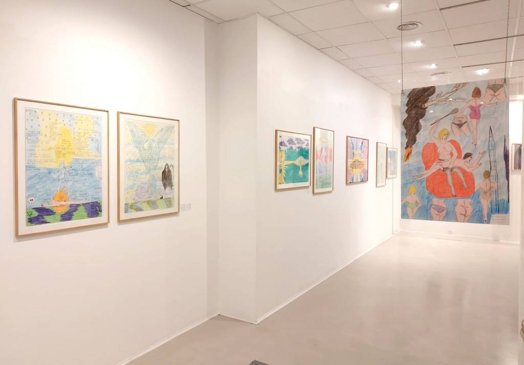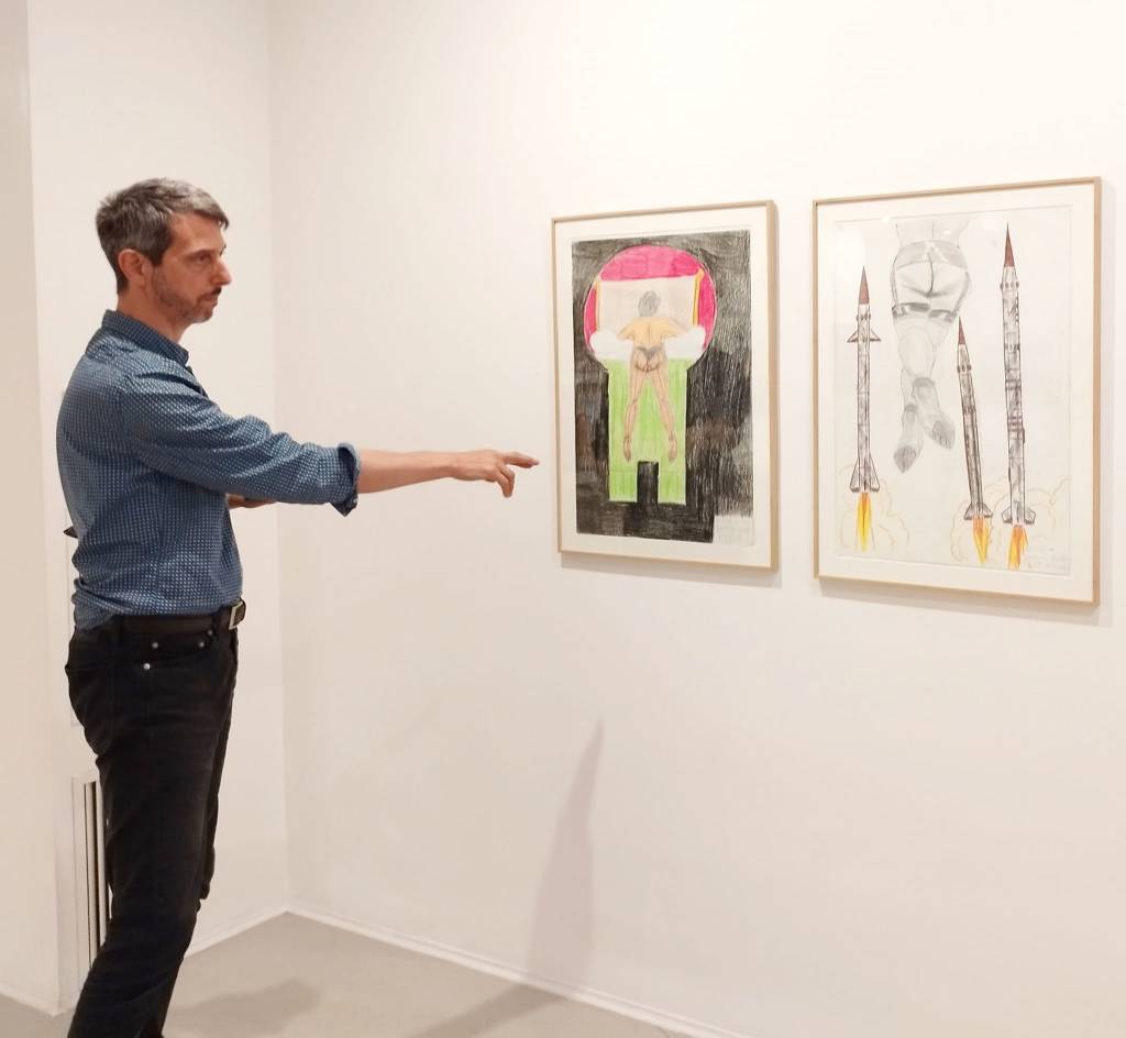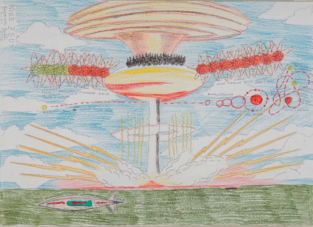 L’immaginario di Giovanni Galli si è nutrito sin dalla sua giovinezza dalla lettura di fumetti, romanzi di fantascienza e letteratura esoterica. Da questi trae ispirazione, stravolgendone i codici. Galli è oggi l’autore e di un’opera colossale composta da migliaia di pagine. Come vignette di un fumetto queste pagine creano l’ossatura di una narrazione infinita raccontata in prima persona. In esse, un alter ego dell’autore convoca l’idea di una bomba nucleare che gli permetterebbe di liberarsi dall’identità di genere che gli è stata assegnata alla nascita. Nel sublimare l’attesa infinita di una esplosione liberatrice, Galli-narratore riunisce un pantheon di personaggi singolari a cui dà corpo e voce: streghe sadiche, divinità egizie, visitatori extra-terrestri e persino un maialino professore di fisica nucleare. La rappresentazione del corpo umano e l’attenzione per i dettagli anatomici caratterizzano i suoi disegni dove il testo si integra in modo evidente oppure si nasconde sotto spessi tratti di pastello. La sua opera radicale e controcorrente ha attraversato diversi momenti di sperimentazione legati alla scoperta di tecniche diverse. Oggi il suo lavoro è una sintesi di disegno, collage e scrittura.