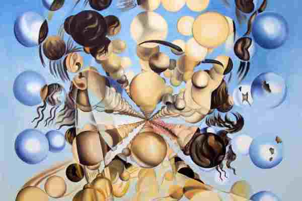 Dalì incontra per la prima volta Elena Ivanova Diakonova, meglio nota come Gala, a Parigi nel 1929, dove si trova per presentare insieme a Bunuel il film Un chien andalou. Di ciò che avverrà dopo è lo stesso Dalì a offrire testimonianza, quando dice che “amo Gala più di mia madre, più di mio padre, più di Picasso e perfino più del denaro”, con la “forza della battaglia di Stalingrado”. Egli si lascia impossessare dal potere immaginifico dell’eros in modo da farne scaturire molteplici visioni. Una foto li ritrae mentre dipinge sulla fronte di lei il volto della Gorgone, mentre nel quadro, il cui titolo completo è Mia moglie, nuda, guarda il suo stesso corpo, che è diventato una scala, tre vertebre della colonna, del cielo e dell’architettura (1945), Gala è raffigurata in una duplice versione. In primo piano, seduta di spalle, la donna osserva il proprio busto che si trova nella medesima postura, in una proiezione geometricamente idealizzata. Alla sua sinistra un dente di leone, simbolo del desiderio, è soffice e ancora intatto. Il suo doppio appare come una sorta di tempio, le cui colonne sorreggono le spalle. Ma ciò che più colpisce è lo spazio vuoto che intercorre tra esse, a evocare, forse, la mancanza di una unione più solida e profonda tra il pittore e la sua musa.