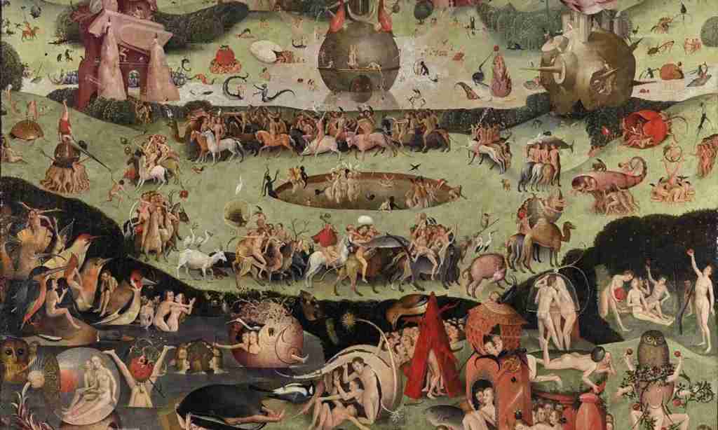 “Ho visto un quadro di Bruegel che rappresenta la Tentazione di Sant’Antonio. […] Un uomo a cavallo in una botte, teste che escono dal ventre di animali; rane con braccia saltellanti sul terreno; un uomo col naso rosso su un cavallo deforme, circondato da diavoli; un drago alato in volo, tutto sul medesimo piano. Insieme formicolante, ghignante in modo grottesco e impetuoso nella precisione di ogni particolare”. Le parole espresse da Flaubert si potrebbero usare per il dipinto che Hieronymus Bosch realizzò sullo stesso tema alcuni decenni prima. Qui, ad attirare l’attenzione, in mezzo alla ridda di figure mostruose che escono dalle spaccature di un frutto gigantesco, è la presenza di un tale che, da buon borghese con la barba curata e il cilindro nero sulla testa, sembra incurante del terribile pandemonio che lo circonda. Che a lasciarlo così tranquillo possa essere l’economia in ascesa che, nelle Fiandre tra Cinquecento e Seicento, vede protagonista la classe sociale cui egli appartiene?