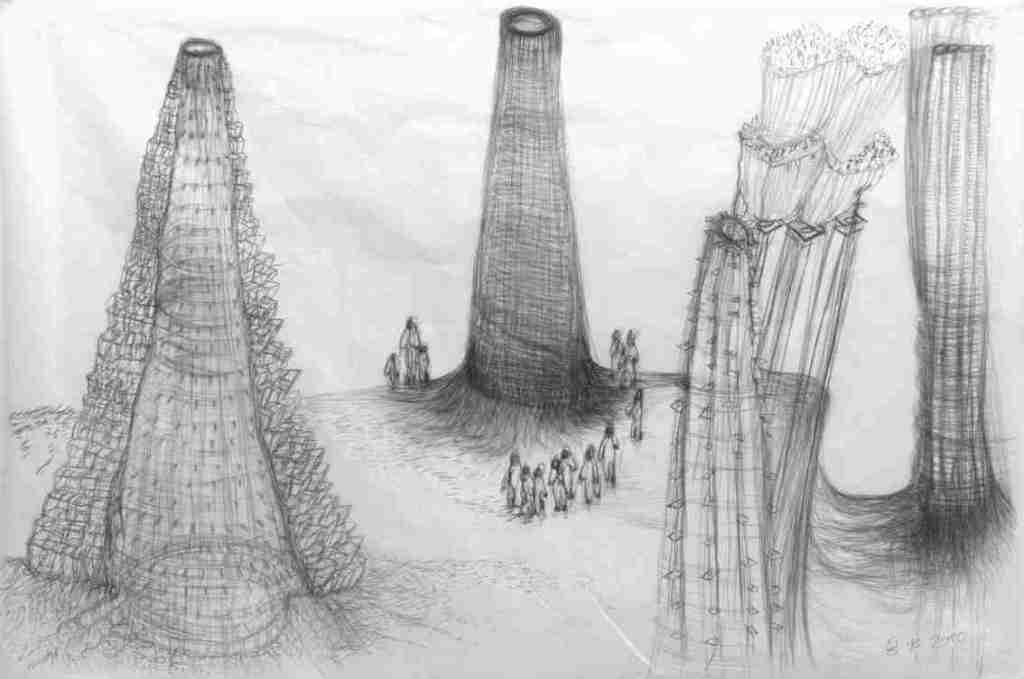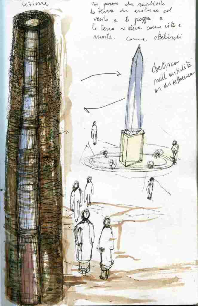 La mia Caverna capovolta è un progetto architettonico permanente apprezzato dall’Art OMI Center di New York, nella sezione Architettura, e valutato per una sua realizzazione. Il progetto concerne diverse fasi di costruzione in cui si usano materiali naturali: quando fu pensato, non vi era ancora questa corrente di bio-architettura, “biologica” e “verde”, che usa tutti materiali naturali. Io, già nel passato dei miei studi e valori, consideravo l’importanza di studiare e progettare con materiali presenti in natura in modo efficiente. La Caverna capovolta è fatta di terra cruda, bambù, corde, e anche le fondamenta sono studiate in modo tale che la profondità nella terra siano una sicurezza di stabilità con ancoraggi particolari.
