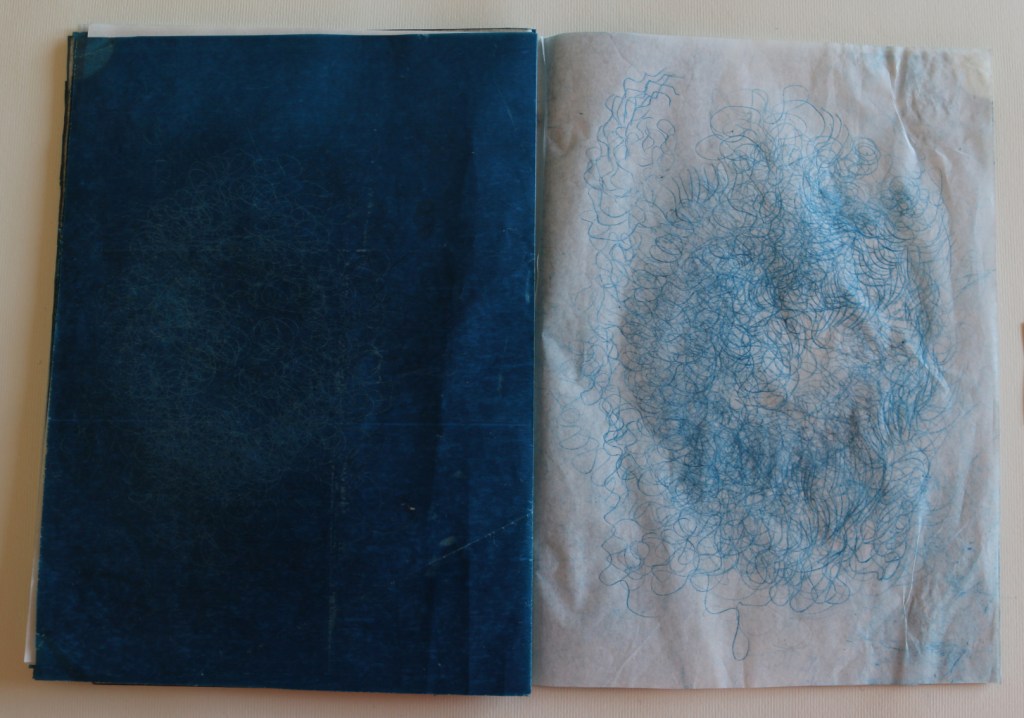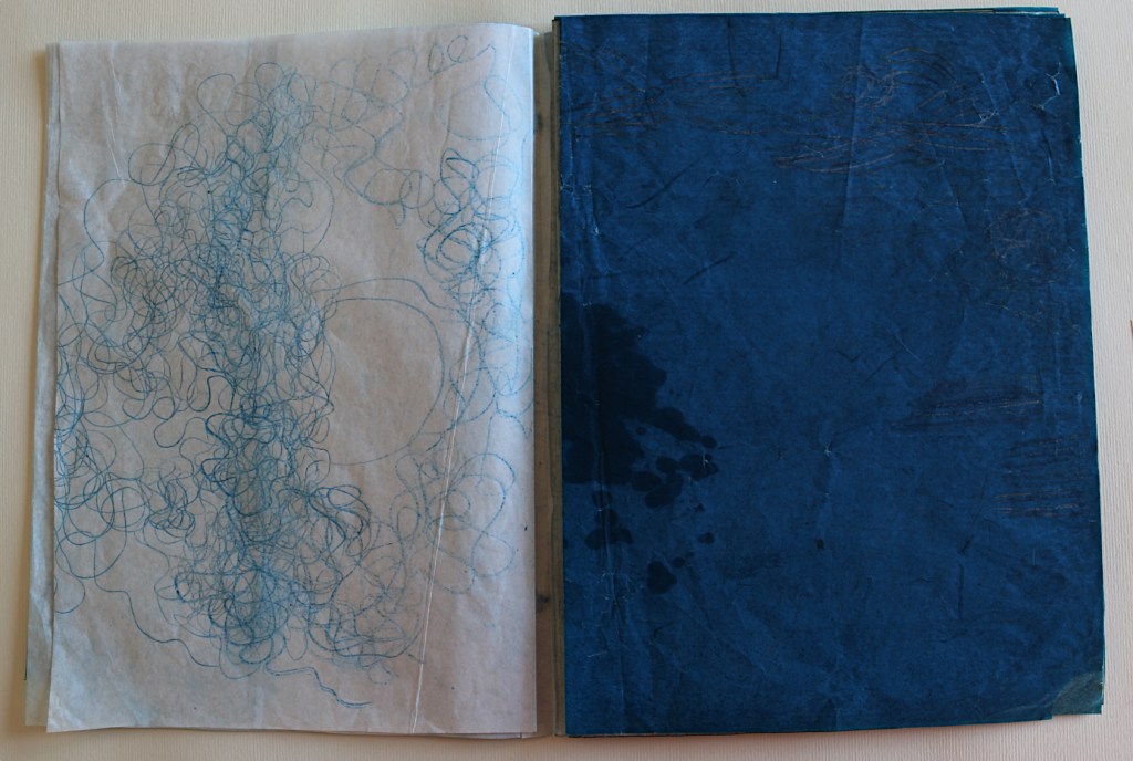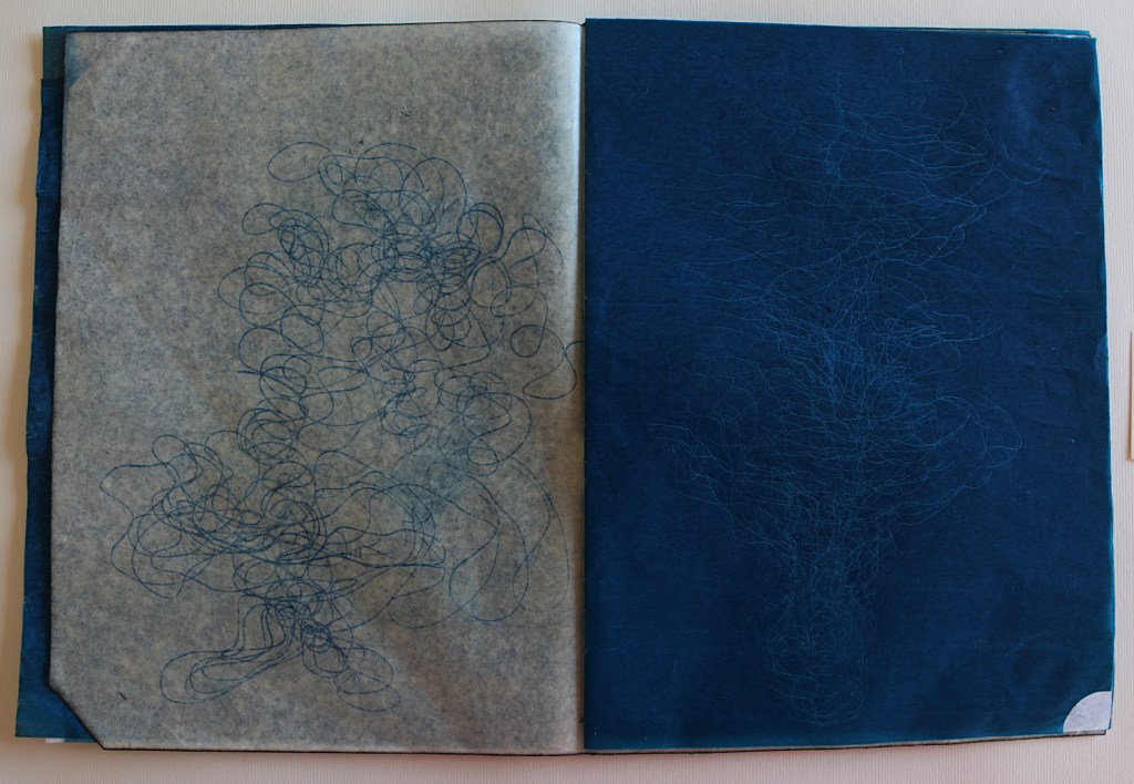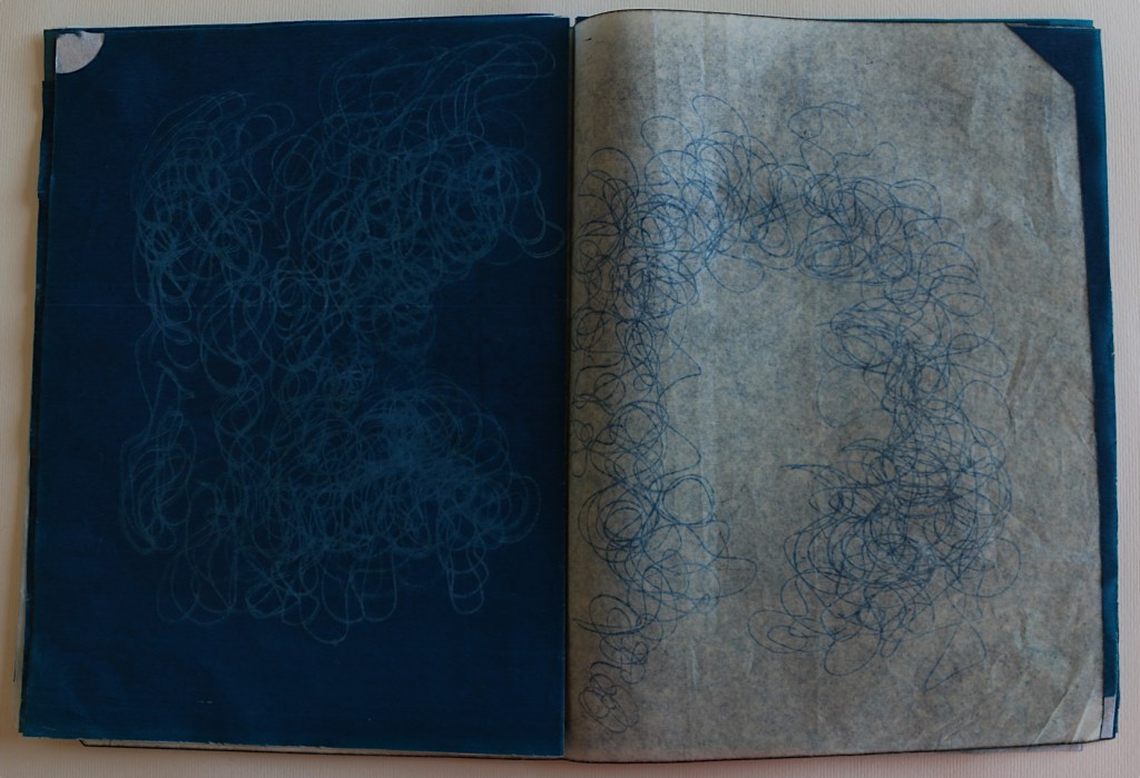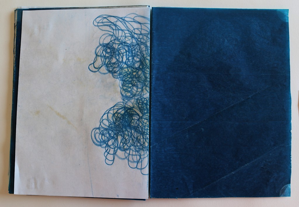 Il libro d’artista che presento alla Galleria The Kitchen a Milano s’intitola L’ora blu : lo si può intendere come il momento del crepuscolo, il momento di sospensione tra notte e giorno, tra sogno e veglia, metafora del contemporaneo di qualcosa che ancora è in divenire e che viene mandato nell’atmosfera visibile per essere sospeso. L’ora blu è il momento di stare da soli: è il passaggio tra un segno di veglia e un segno di sonno, quando ci si risveglia al prossimare del giorno che non è ancora visibile, quando non riesci ancora a vedere un profilo preciso anche nella tua mente. Il tempo che dura questo momento non è precisamente di 60 minuti cambia in base alle stagioni al luogo in cui ti trovi e dove stai andando o dove ti fermerai; è volubile è impalpabile e la materia dei fogli è molto delicata: nel toccarli i polpastrelli si macchieranno di blu e sarai anche tu portato nell’ora blu, i fogli non sono legati tra loro e la successione delle immagini non va cambiata quindi occorrono mani delicate attente nello sfogliare questo libro perché, se fossero legate le pagine, col muoverle si potrebbero strappare.