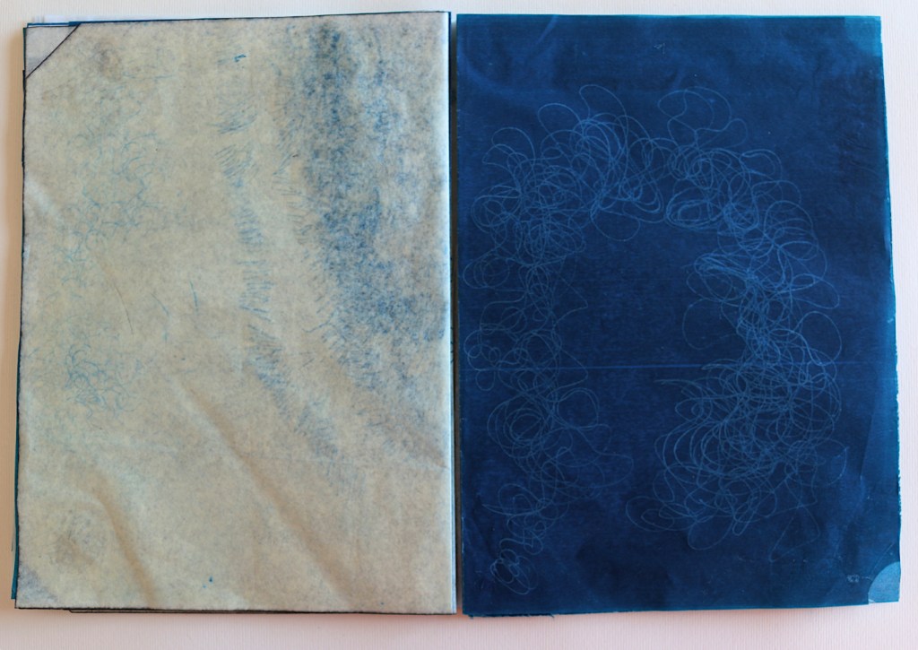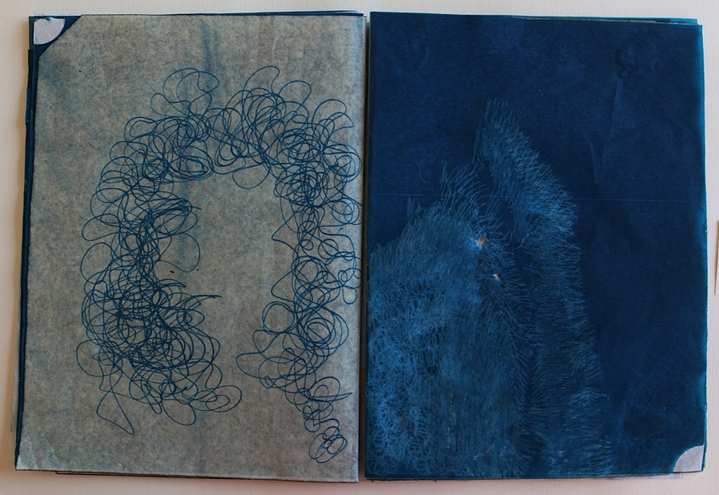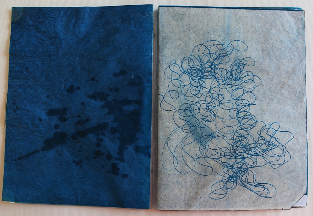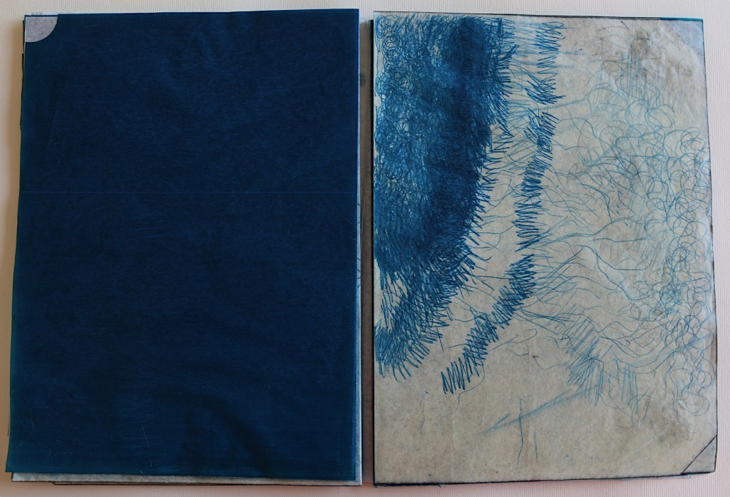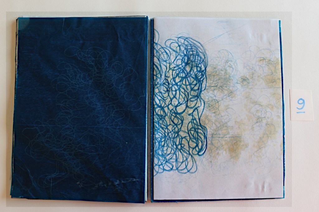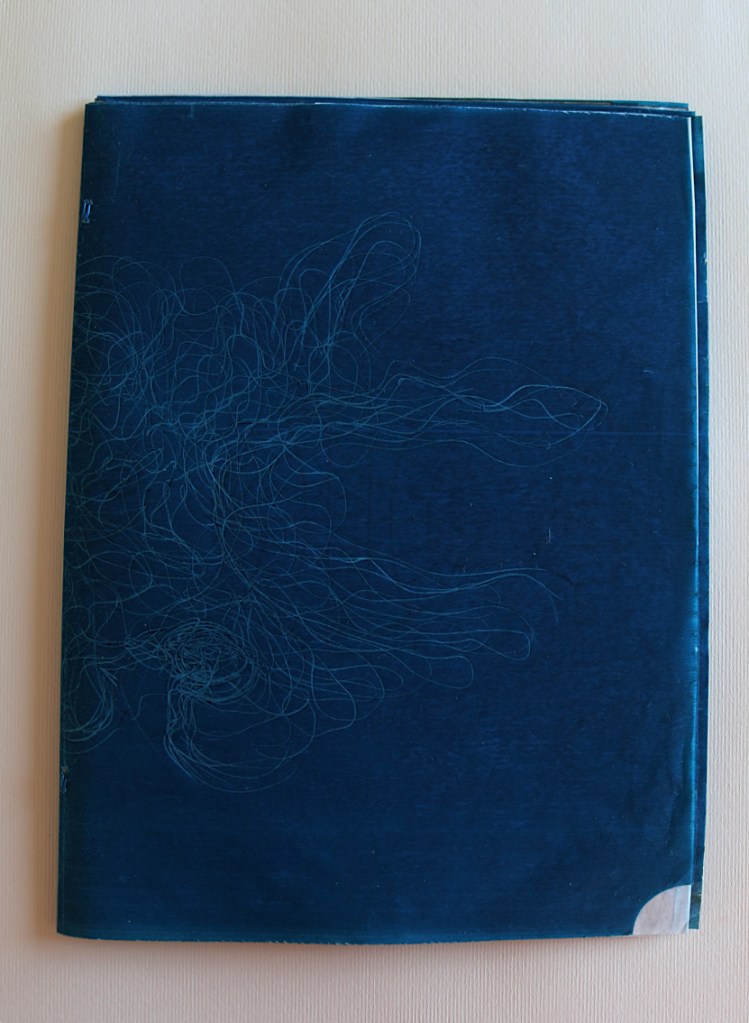 Il libro d’artista che presento alla Galleria The Kitchen a Milano s’intitola L’ora blu : lo si può intendere come il momento del crepuscolo, il momento di sospensione tra notte e giorno, tra sogno e veglia, metafora del contemporaneo di qualcosa che ancora è in divenire e che viene mandato nell’atmosfera visibile per essere sospeso. L’ora blu è il momento di stare da soli: è il passaggio tra un segno di veglia e un segno di sonno, quando ci si risveglia al prossimare del giorno che non è ancora visibile, quando non riesci ancora a vedere un profilo preciso anche nella tua mente. Il tempo che dura questo momento non è precisamente di 60 minuti cambia in base alle stagioni al luogo in cui ti trovi e dove stai andando o dove ti fermerai; è volubile è impalpabile e la materia dei fogli è molto delicata: nel toccarli i polpastrelli si macchieranno di blu e sarai anche tu portato nell’ora blu, i fogli non sono legati tra loro e la successione delle immagini non va cambiata quindi occorrono mani delicate attente nello sfogliare questo libro perché, se fossero legate le pagine, col muoverle si potrebbero strappare.