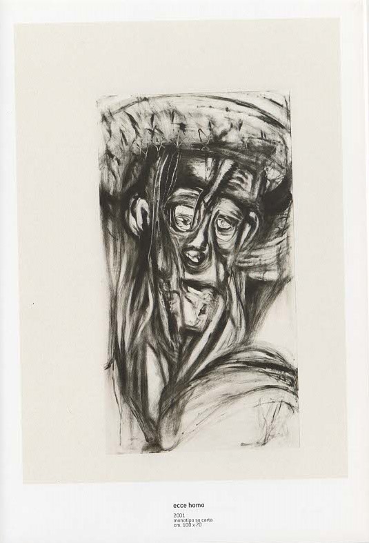 C’è anche un altro trucco che Paola Ricci nelle lunghe stazioni davanti ai teleri di Tintoretto riesce a scrutare. Quel turbinio di segni a spirale, una luminosità che si fa strada dal buio e fa apparire le figure in lontananza, prive di contorni, come una moltitudine spettrale ( si veda il Battesimo nella sala superiore di San Rocco e il Trafugamento del corpo di San Marco alle Gallerie dell’Accademia ). La pittura di Tintoretto diventa una tecnica fra le più elevate pensando sia alla formazione spontanea del padre tintore da cui prende il nome come un ragazzo di bottega con la famigliarità per i rossi di robbia, i cremisi e i paonazzi. Ma la sfida veneziana al colore si compie con l’orpimento e il realgar colori gialliarancione e rossi, grandemente tossici per la presenza di arsenico, fino a quel colore ultimo e prezioso quanto i lapislazzuli dell’Afghanistan, che si chiama momia, cioè mummia. Il pigmento proviene dalla triturazione di mummie egiziane, che a Venezia era usato anche nella preparazione della “teriaca” il medicinale multiuso dai prodigiosi effetti di un placebo. Questa densa materia cromatica sta nella pittura che Paola Ricci analizza e scopre nelle sue fibre e arriva a quel paesaggio di Santa Maria Egiziaca, dove la struttura organizzata del colore sembra non esistere più perché la preparazione nera disegnata-dipinta a biacca quando il fondo non era ancora essiccato, diventa un colore ulteriore che parte da un azzeramento, una densità assoluta e totale come il fondo trasparente che Paola Ricci sa far venir fuori, dalle palme fossili attraverso riflettenti trasparenze. Su questa superficie ricomposta e rigenerata la pittura e il colore sembrano rinascere nelle figurazioni fantasmatiche che Paola Ricci vede riemergere dagli sfondi tintorettiani e diventano quell’esercizio riconoscibile di figure corporee perfettamente astratte, quanto concrete, come tolte dalle ombre ormai impresse per sempre sui muri. In questo senso anche i volti sono ricondotti a una forma riconoscibile, come nuove sindoni di un Christus patiens e prendendo ora la drammatica configurazione di una maschera d’ossa, ora la faccia gonfia di un clown troppo umano. Volti che riemergono necessari, ai quali anche un Dio vuole assomigliare…Per essere più simili alle creature.