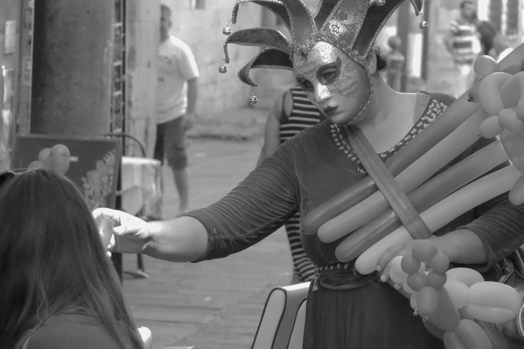 “Non si avvicini, cambi vicolo. Questo è il mio vicolo, lo coloro e lo addobbo da anni. Avrà ben visto in tutta la città di C. il mio arredo urbano. Metto anche rami di palma. Sono grandi e secchi. Non li calpesti, scricchiolano forte, troppo forte, possono attirare l’attenzione, qualcuno chiederebbe di toglierli. So che mi invidiano. Eppure faccio il bene di tutti, diffondo il Bene, incido i tronchi, scrivo dappertutto, dispongo fiori e ortaggi per il bene di tutti, per la salvezza di tutti perché siete tutti deviati, avete bisogno di fiori, di mediatori con l’Altissimo che non parla con il primo venuto. Sì, io porto la sua parola, la Verità, sono la stagione della semina e della raccolta. Fra le due intanto imbratto i muri, le fontane, le porte, gli sportelli, i vicoli, quello che trovo e che mi prendo, nessuno mi disturba; soltanto uno un giorno ha provato e gli ho sputato in faccia. Non aveva capito niente, non aveva visto l’aureola di fiori che circonda il mio cappello, la mia aura sacerdotale, il mio incedere. In ogni caso, lei cambi vicolo, si dimentichi delle ghirlande e delle palme, delle carote e delle mele: marciranno fra pochi giorni ma nessuno oserà levarle.”